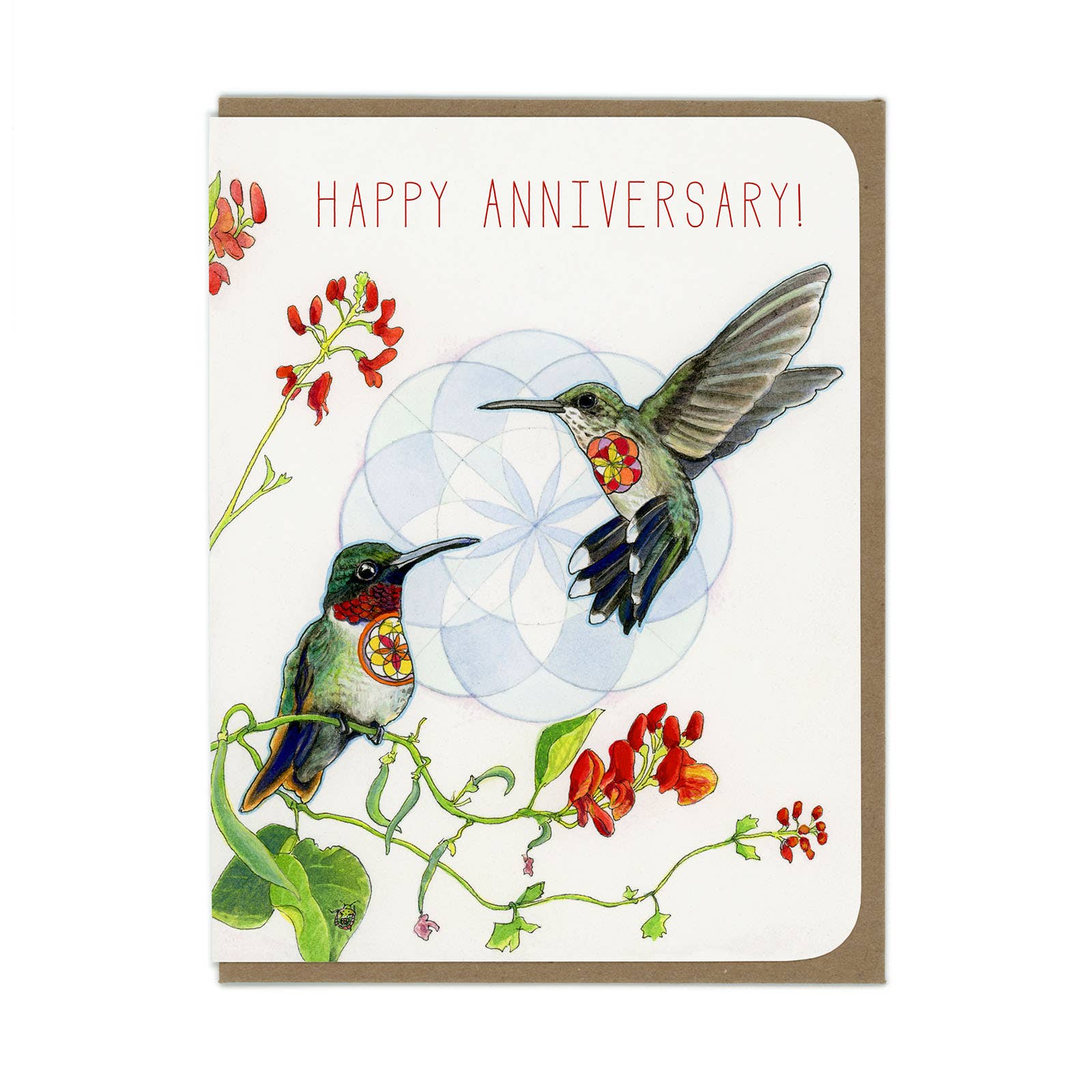 A lovely little card for people celebrating their love from a watercolor and ink painting of ruby-throated hummingbirds. Front: "Happy anniversary!".
