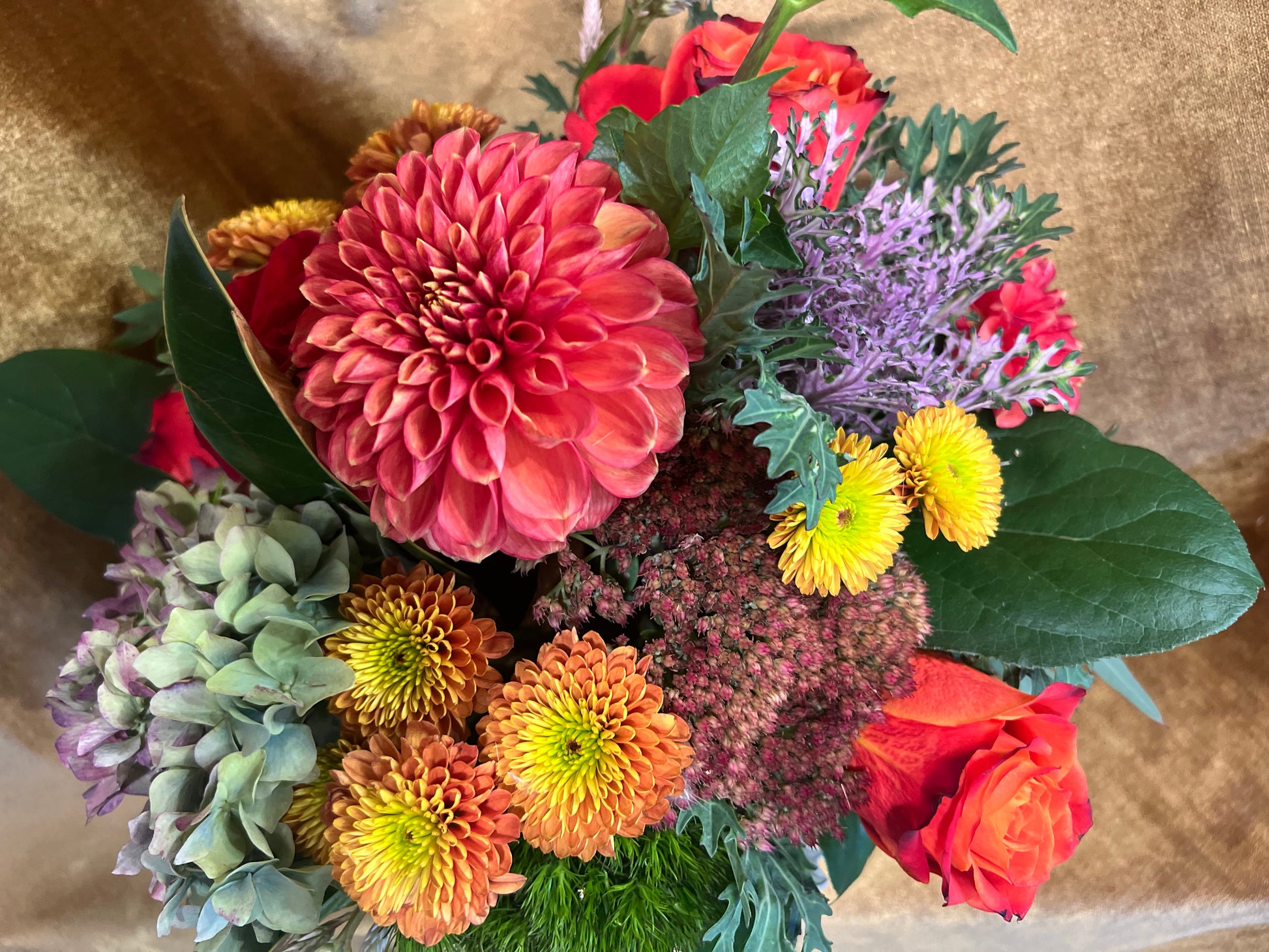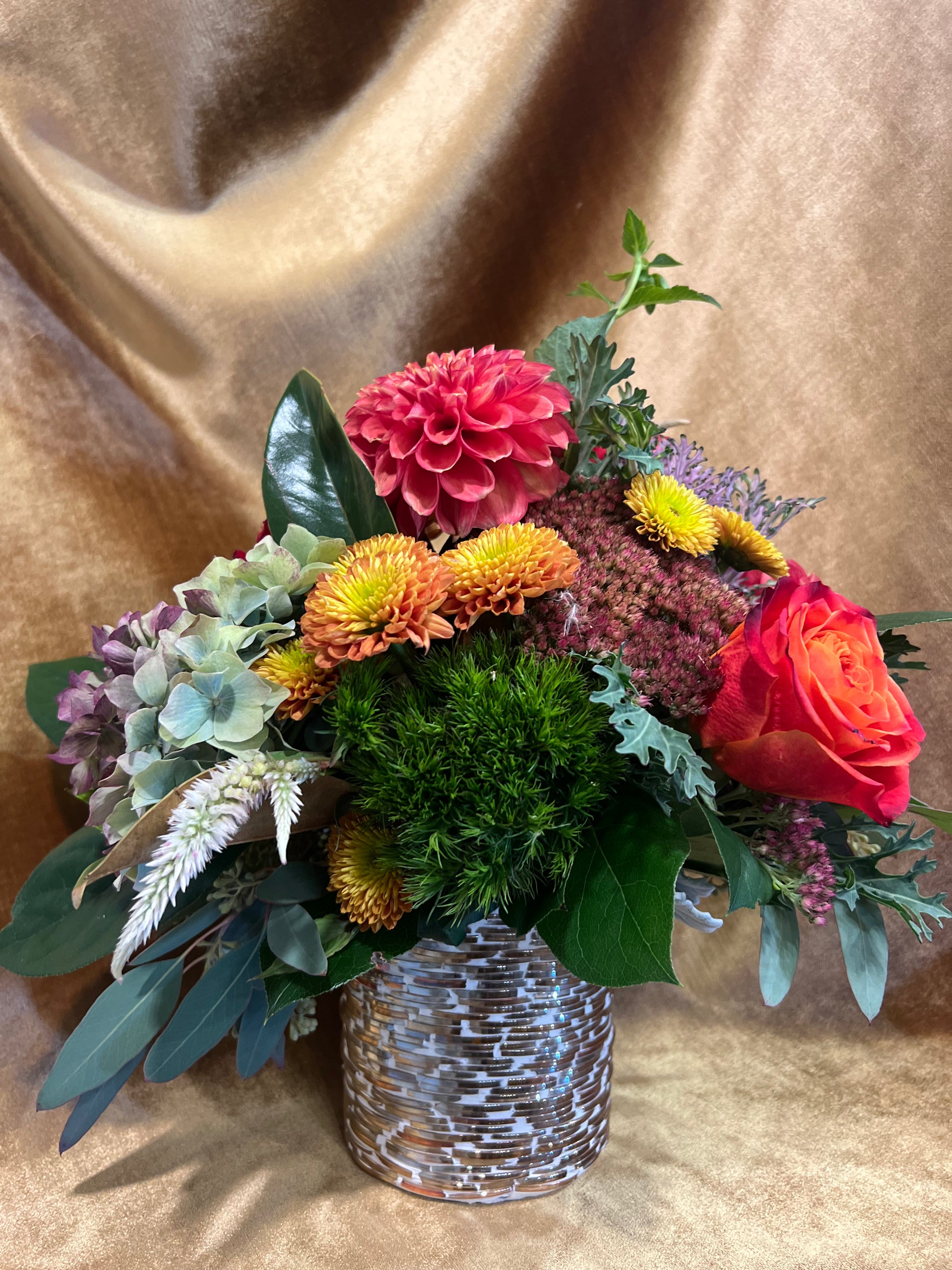 A glowing tribute to fall’s warmth and richness. Autumn Opal features fiery orange roses, golden mums, coral dahlias, and soft hydrangea tones nestled among moss, eucalyptus, and kale. Arranged in a textured glass vase that shimmers like an opal, this design captures the essence of the season — earthy, vibrant, and effortlessly elegant.