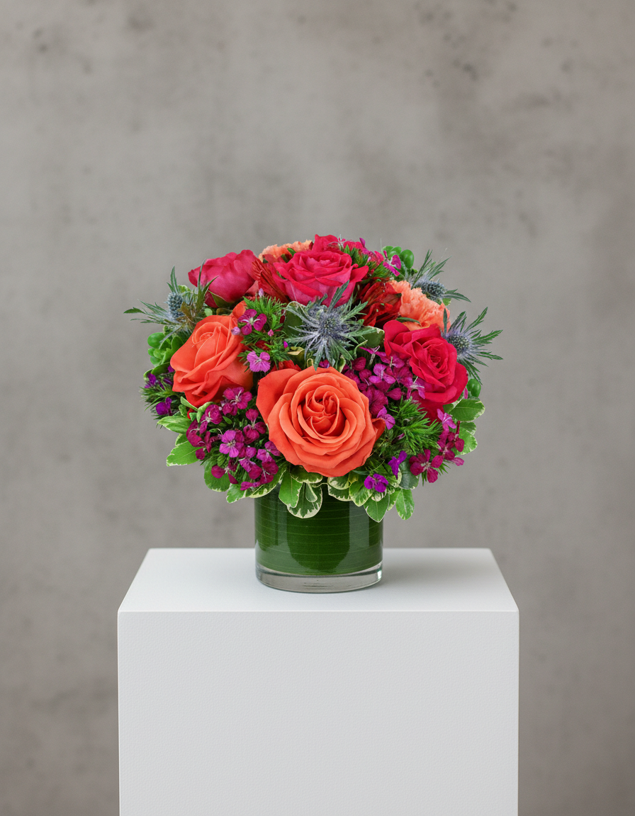 This bright and cheery design packs a punch with its lush Roses, Carnations, Alstroemeria, and premium foliage in a leaf-lined vase. Our Bellini Punch arrangement will brighten someone's day and is made from the freshest flowers available. It's the perfect choice for a housewarming or congratulatory gift. The flowers and container may vary based on availability.