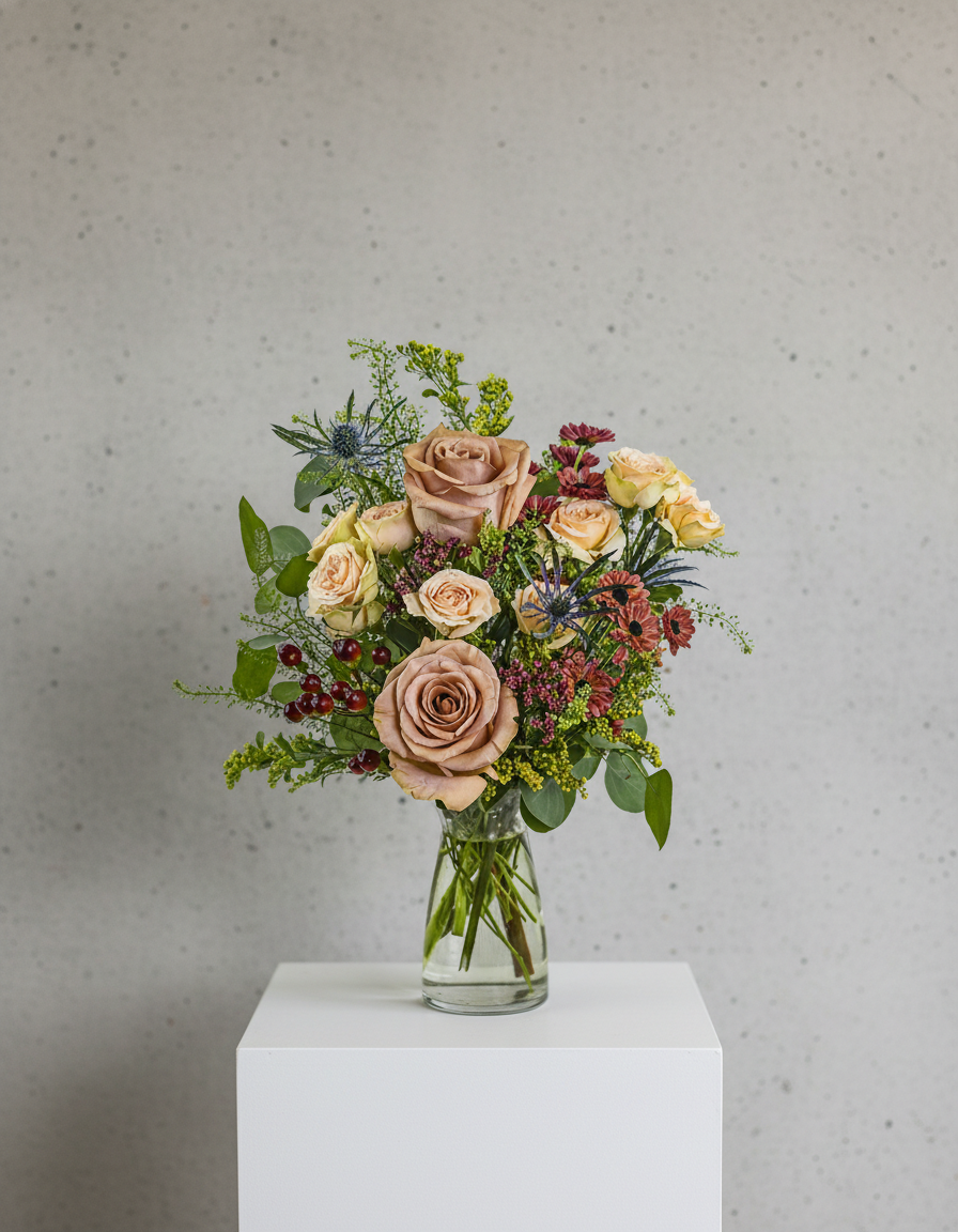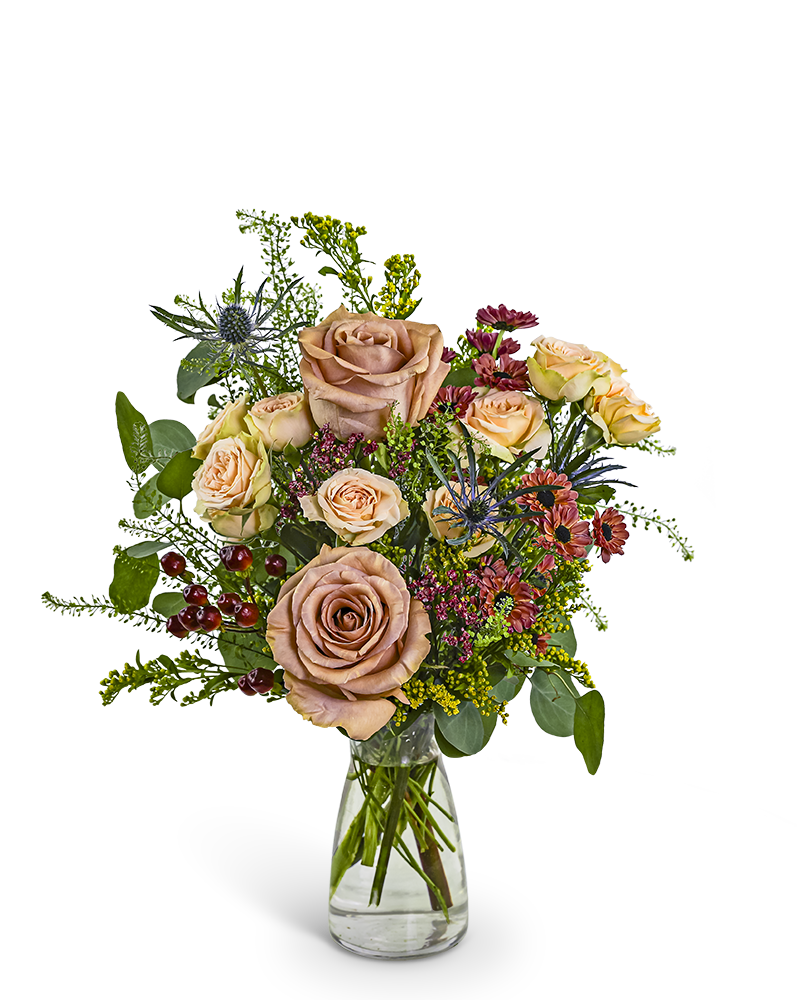 Chestnut Blush is a graceful arrangement featuring soft neutral Roses, Berries, Thistle, and seasonal accent blooms in warm autumn tones. Designed in a clear glass vase, it's perfect for birthdays, anniversaries, or thoughtful flower delivery just because. Our local florist may make tasteful substitutions to ensure freshness and maintain the beauty of the design.