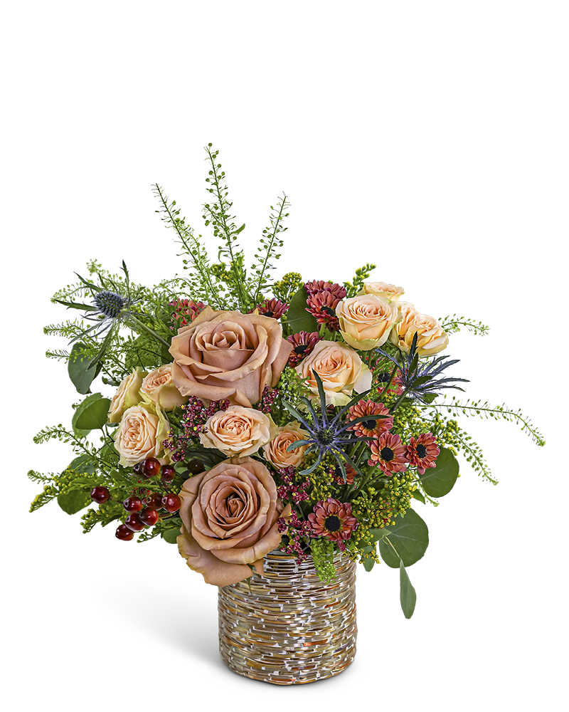 Chic Chestnut Glow is a graceful arrangement featuring soft neutral Roses, Berries, Thistle, and seasonal accent blooms in warm autumn tones. Designed in a rustic mosaic vase, itÕs perfect for birthdays, anniversaries, or thoughtful flower delivery just because. Our local florist may make tasteful substitutions to ensure freshness and maintain the beauty of the design.