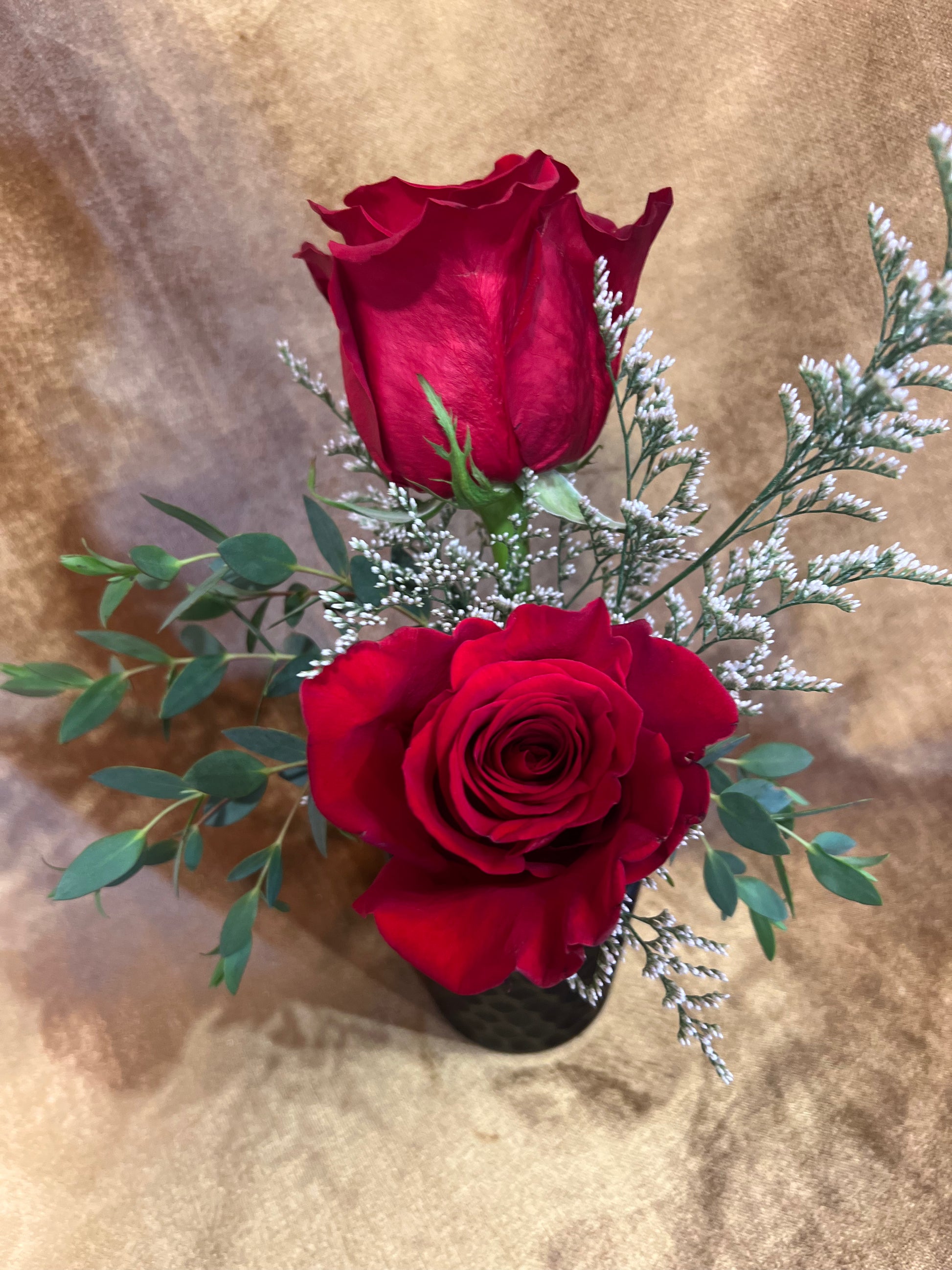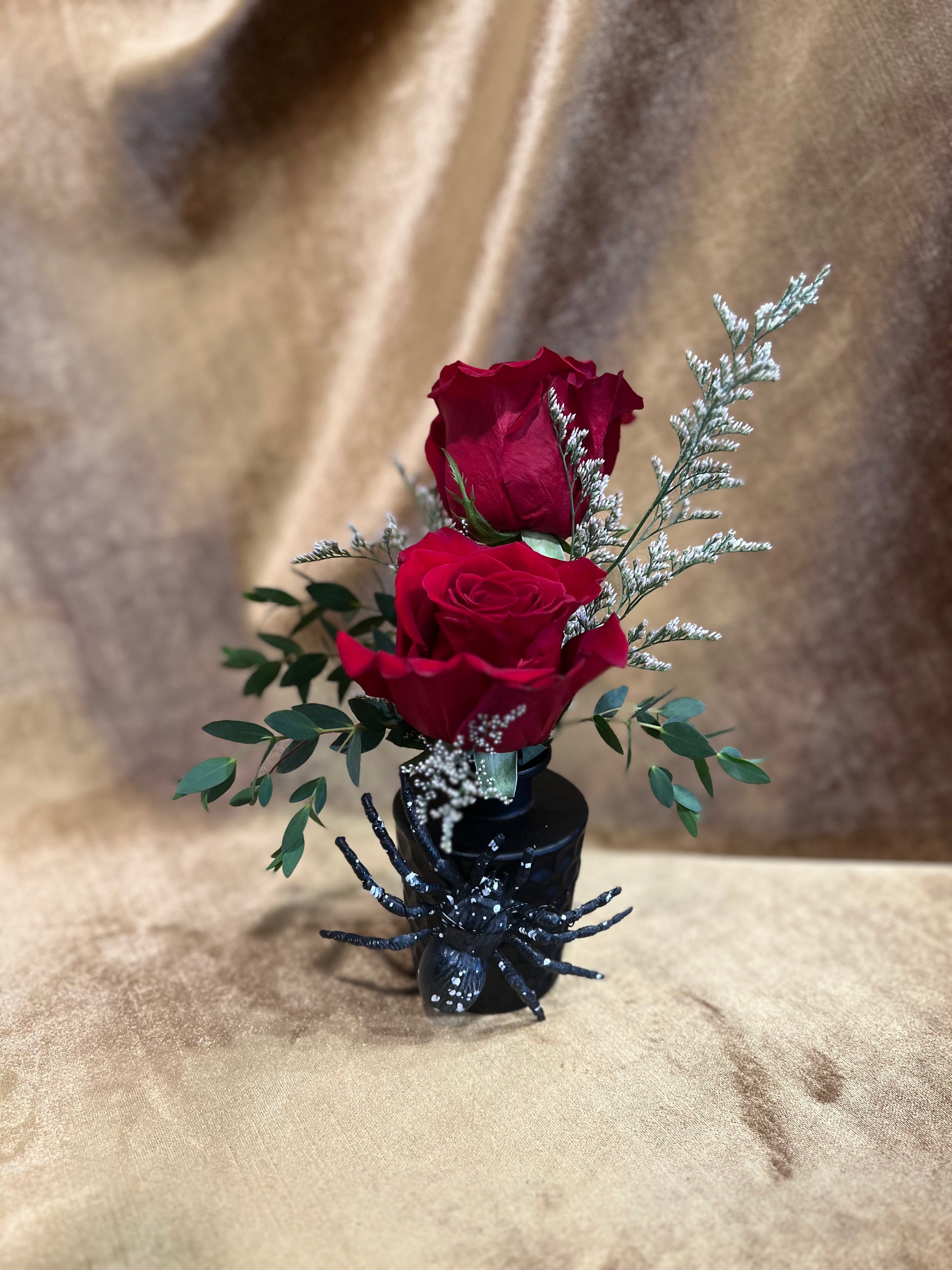 A simple, elegant expression of romance. Two velvety red roses accented with airy white filler and soft greenery rest in a sleek black vase, creating a striking balance of passion and sophistication. Classic Love is perfect for anniversaries, heartfelt gestures, or moments that call for something beautifully timeless.