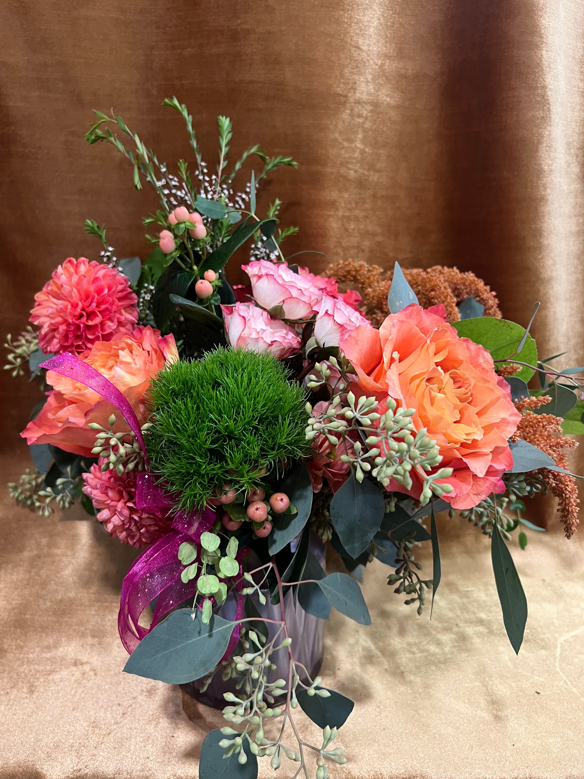 A playful burst of bold blooms and vibrant texture. Featuring coral garden roses, pink lisianthus, orange dahlias, and fluffy green trick dianthus, accented with eucalyptus, peach hypericum berries, and rust-colored astilbe. Finished with a pop of fuchsia ribbon, this design is pure joy in floral form—bright, lush, and irresistibly full of life.
