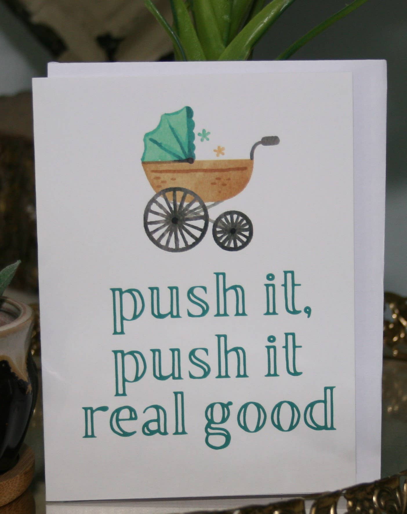 Push it! Push it! Greeting Card measures 4.25"x 5.5" Blank inside. We can hand write your sentiment inside for you!