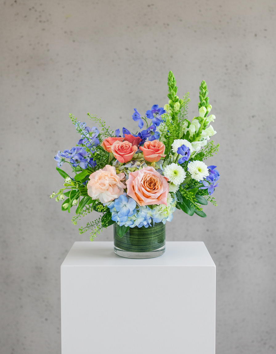 Experience the enchanting allure of the Enchanted Juliette flower design. This breathtaking arrangement of peach and blue blossoms features a delightful combination of Roses, Delphinium, Carnations, Mums, Hydrangea, Snapdragons, and premium foliage. Expertly arranged in a leaf-lined cylinder vase, this design exudes elegance and sophistication, making it a perfect gift for any occasion. Whether you're celebrating a birthday, or an anniversary, or want to brighten someone's day, this stunning floral creation is a perfect choice.