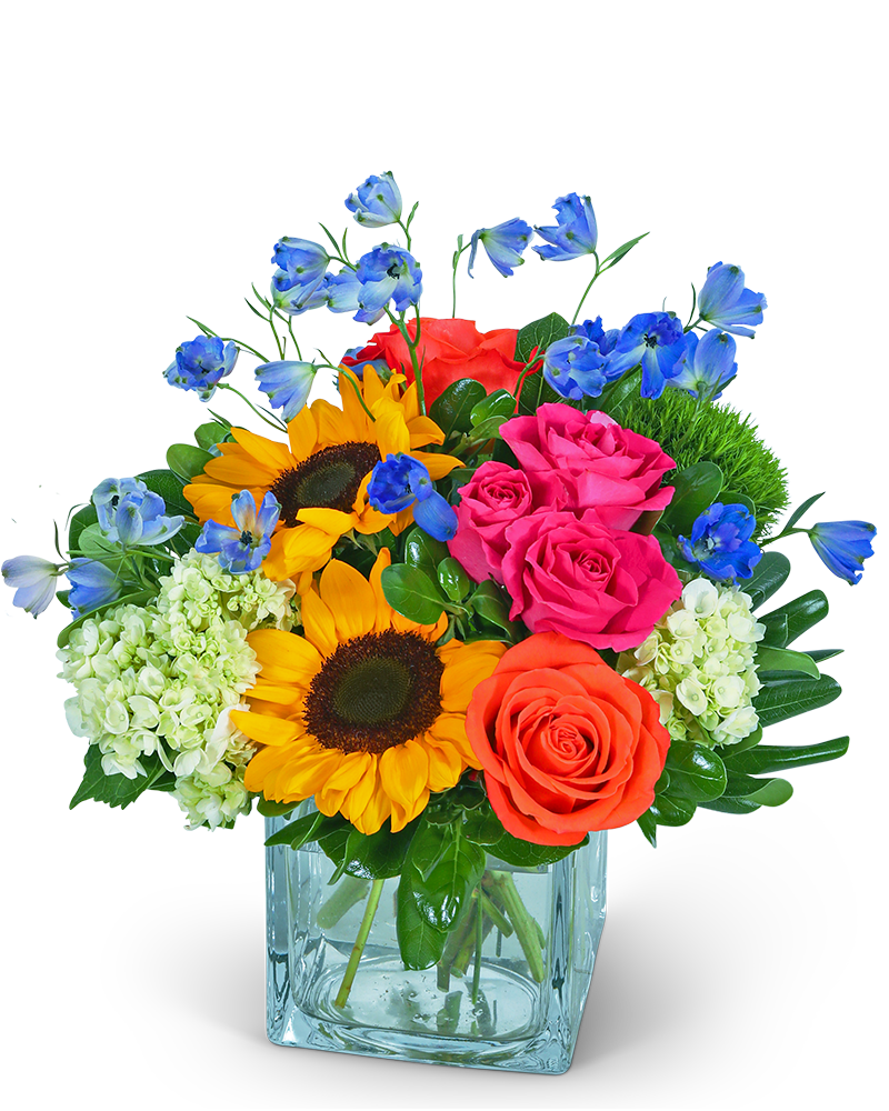 Immerse yourself in a kaleidoscope of vivid blooms with our Enchanting Valencia flower design. This captivating arrangement bursts with bold, bright colors from the rainbow, featuring sunflowers, roses, hydrangeas, delphinium, green trick dianthus, and various foliage. Whether it's a birthday celebration or any special event that calls for a burst of color, the Enchanting Valencia flower design is the perfect choice. It embodies the essence of joy, positivity, and celebration, making it a delightful gift for your loved ones or a beautiful addition to your own space.