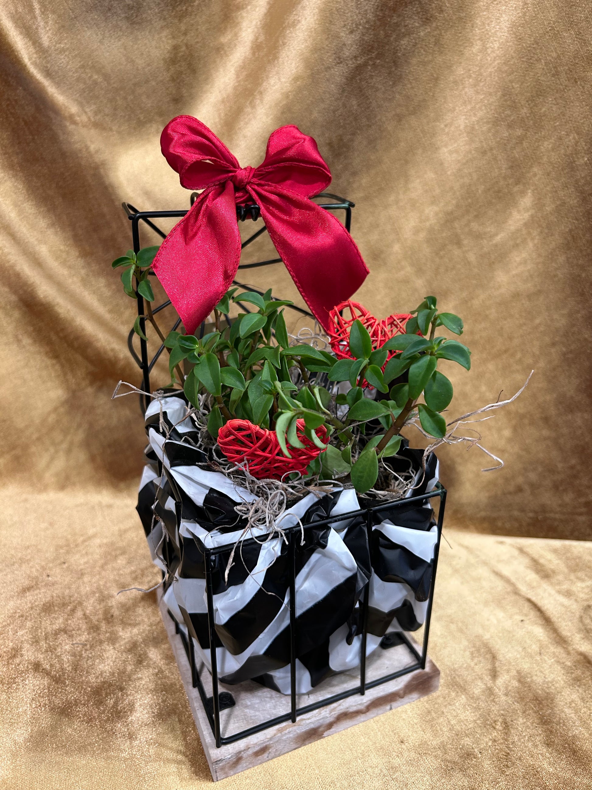 Send love with Free Love! This vibrant lipstick plant is caged in a container adorned with red hearts and a bow, adding a playful touch to any space. Embrace the power of plants and add a pop of color to any space!