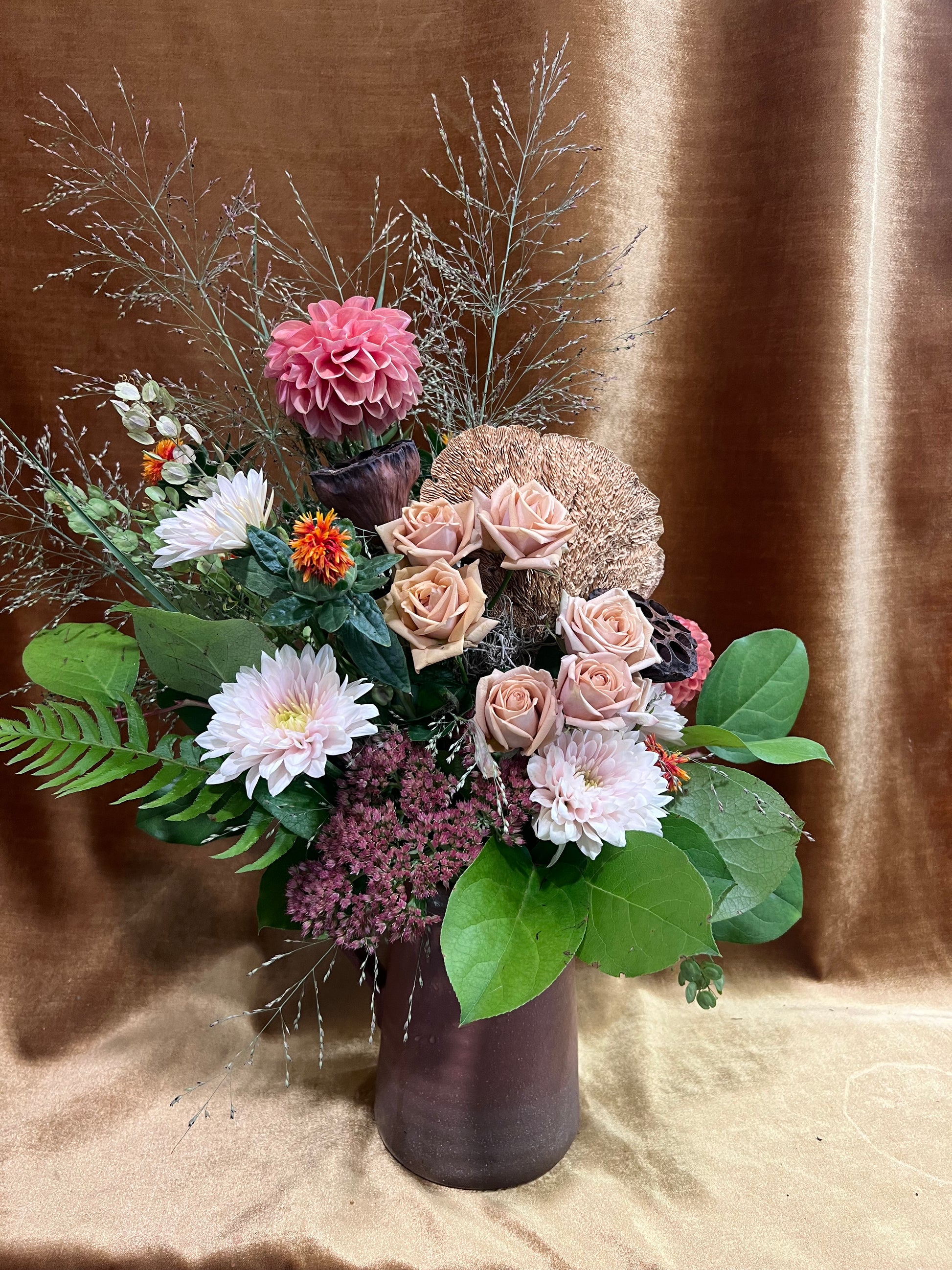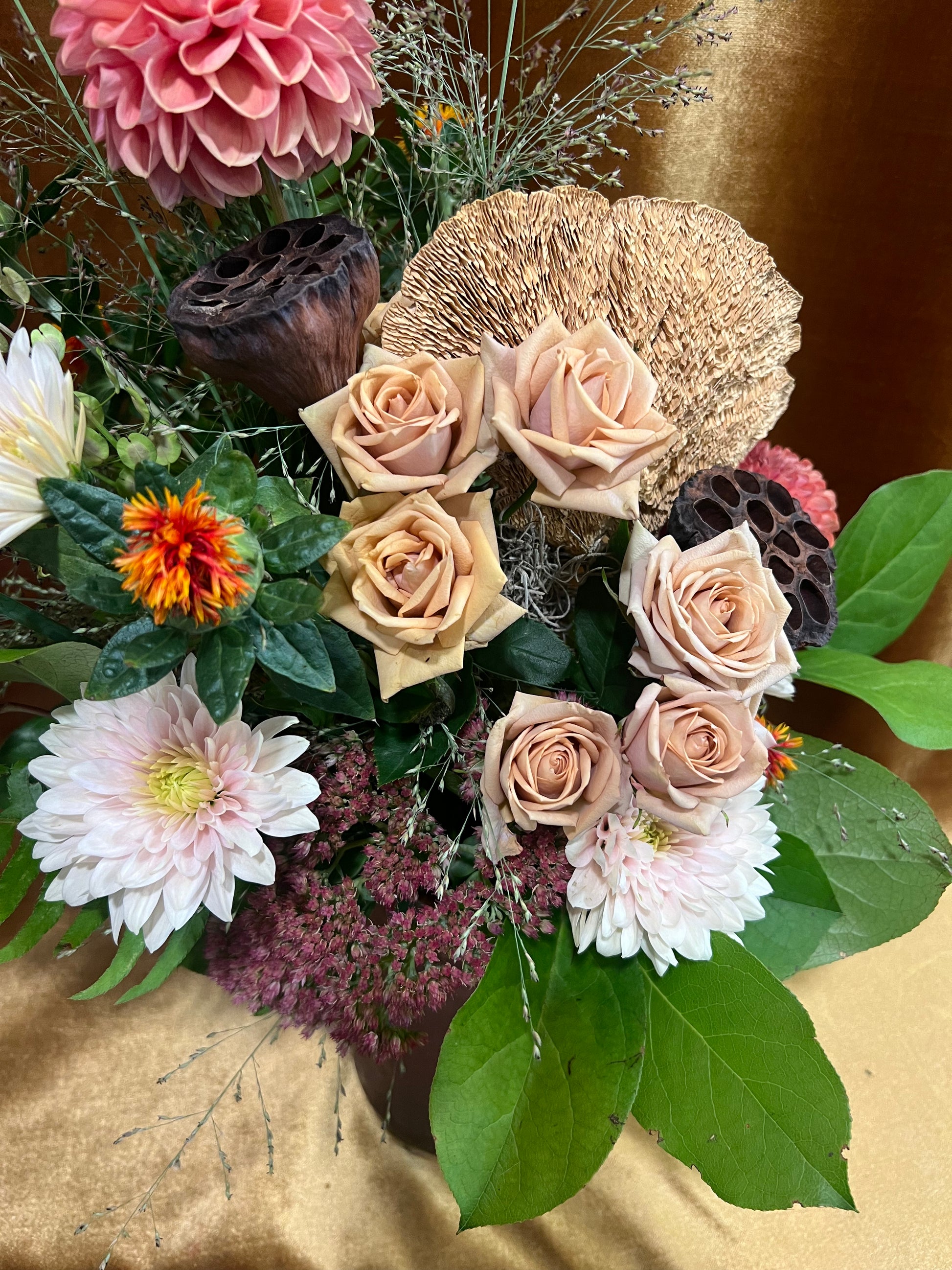 A warm, earthy arrangement that captures autumn’s quiet luxury. Featuring blush roses, pink dahlias, creamy chrysanthemums, and safflower accents—layered with dried lotus pods, textural mushrooms, and golden sedum. Lush greens and airy grass add balance and movement. Designed in a matte bronze vessel, this bouquet radiates grounded elegance and timeless beauty.