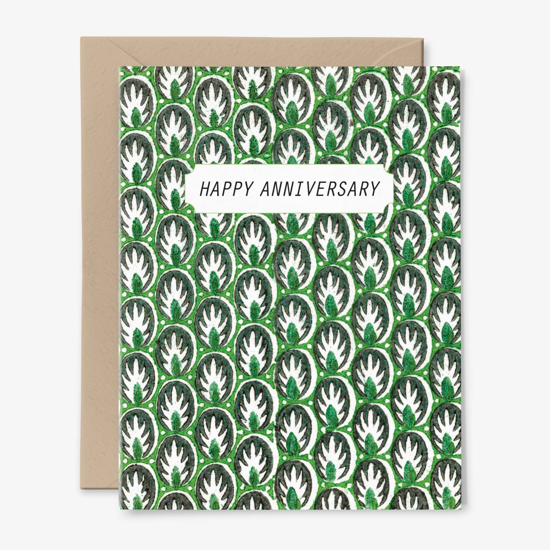 High-quality anniversary card digitally printed with an antique floral inspired pattern. Blank Inside. 4.25" x 5.5" (A2). Printed in the USA on 100% PCW recycled 110lb heavyweight card stock. Includes a kraft paper envelope.