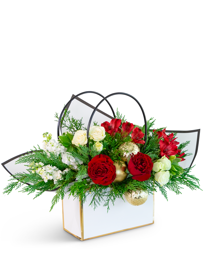 Our Holiday Cheer Tote is a festive mix of reds, whites, and greens in a vibrant flower arrangement destined to spread joy and merriment. Our commitment to quality guarantees a stunning display, with potential variations from the flowers depicted. Presented in a chic Flower gift tote bag, this captivating arrangement will not only bring a touch of holiday spirit to the recipient's day but also provide easy transport and delivery for a thoughtful and convenient gift-giving experience.
