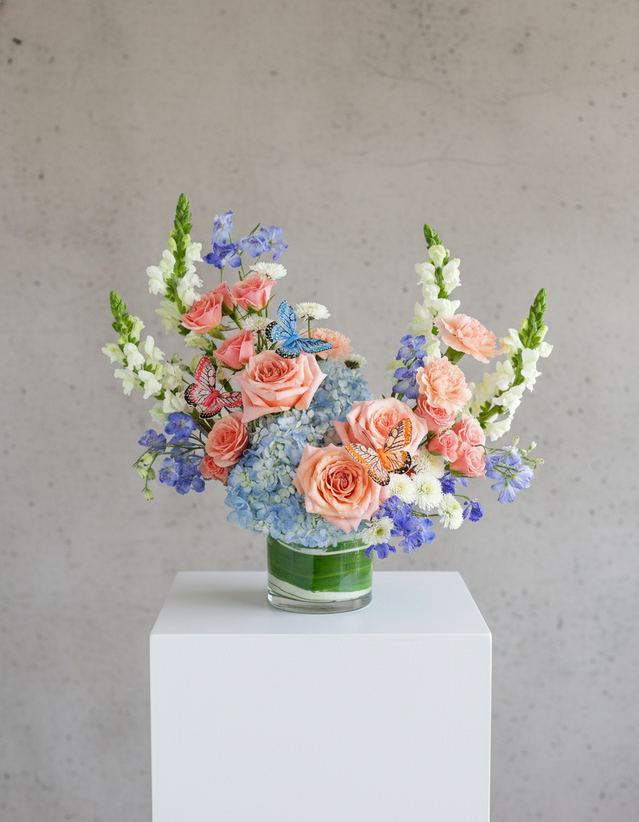 Experience the enchanting allure of our Juliette Butterfly Oasis flower design. This breathtaking arrangement of peach and blue blossoms features a delightful combination of Roses, Delphinium, Carnations, Mums, Hydrangea, Snapdragons, and premium foliage accented with sweet butterflies. Expertly arranged in a leaf-lined vase, this design exudes elegance and sophistication, making it a perfect gift for any occasion.