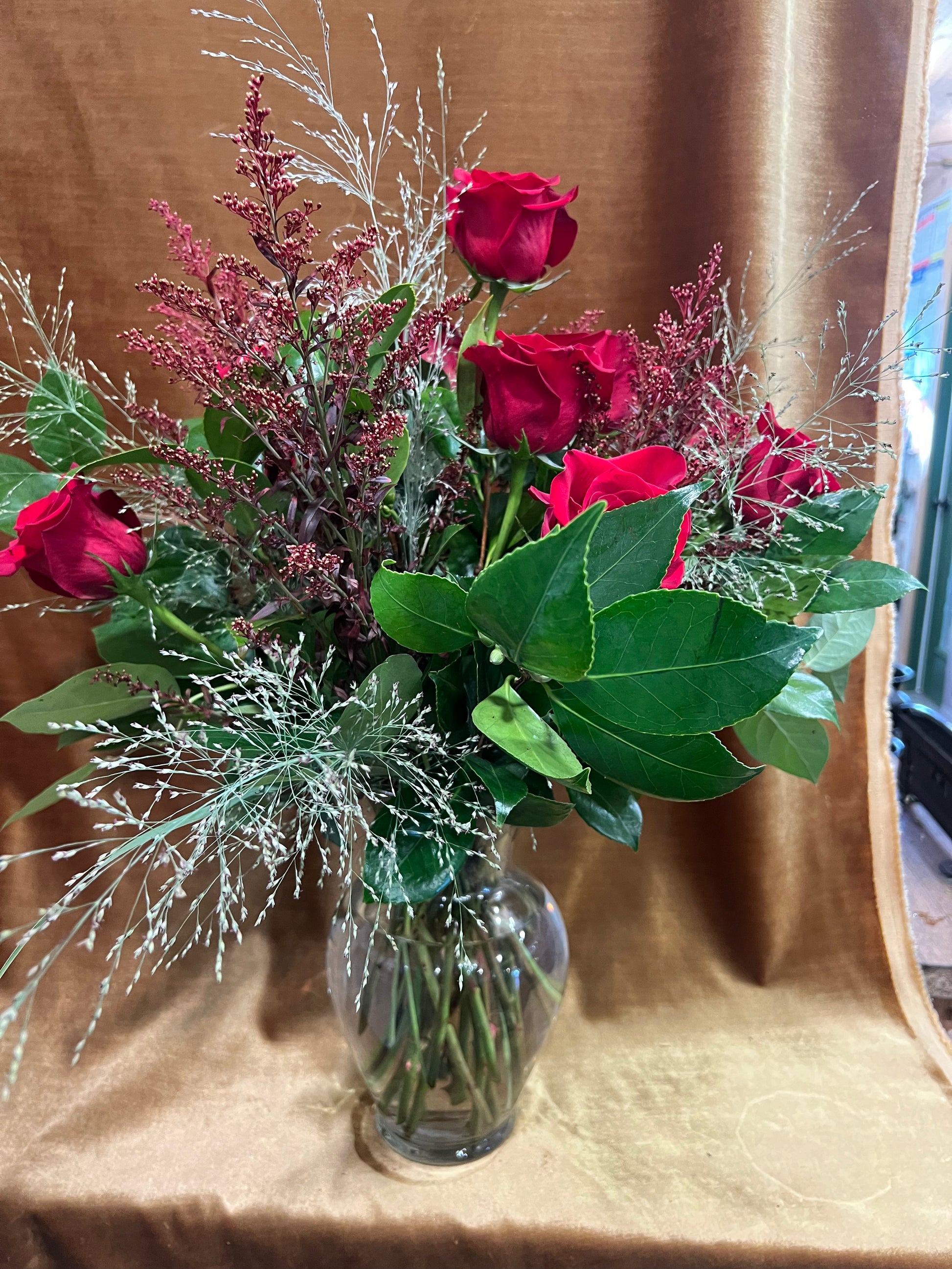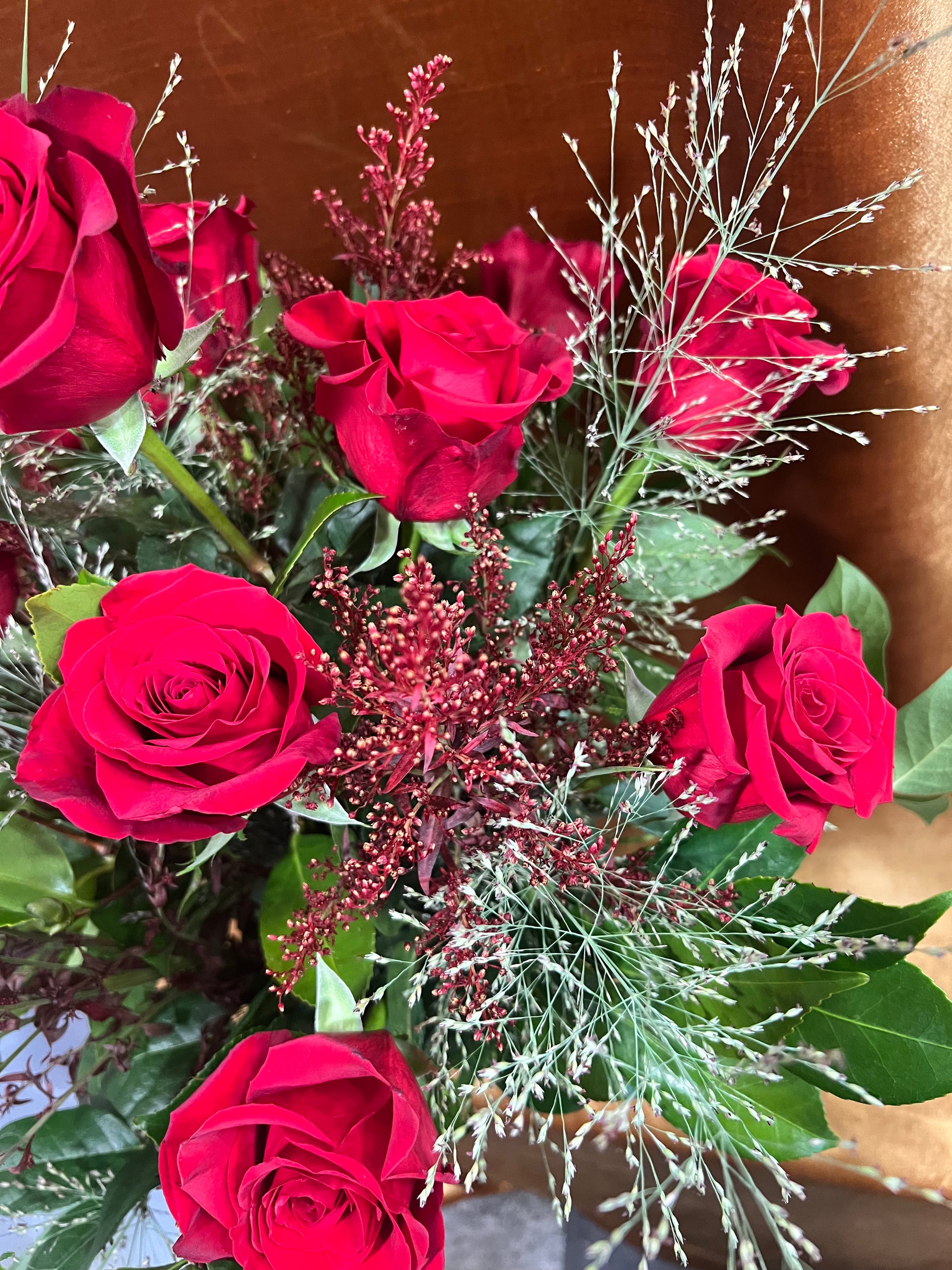 A classic dozen red roses ignited with passion and elegance. Lush greenery and wisps of sparkling ornamental grass create a dreamy, romantic texture, while burgundy astilbe adds depth and movement. Designed in a clear glass vase, this timeless arrangement radiates warmth, love, and the kind of beauty that sets hearts ablaze.