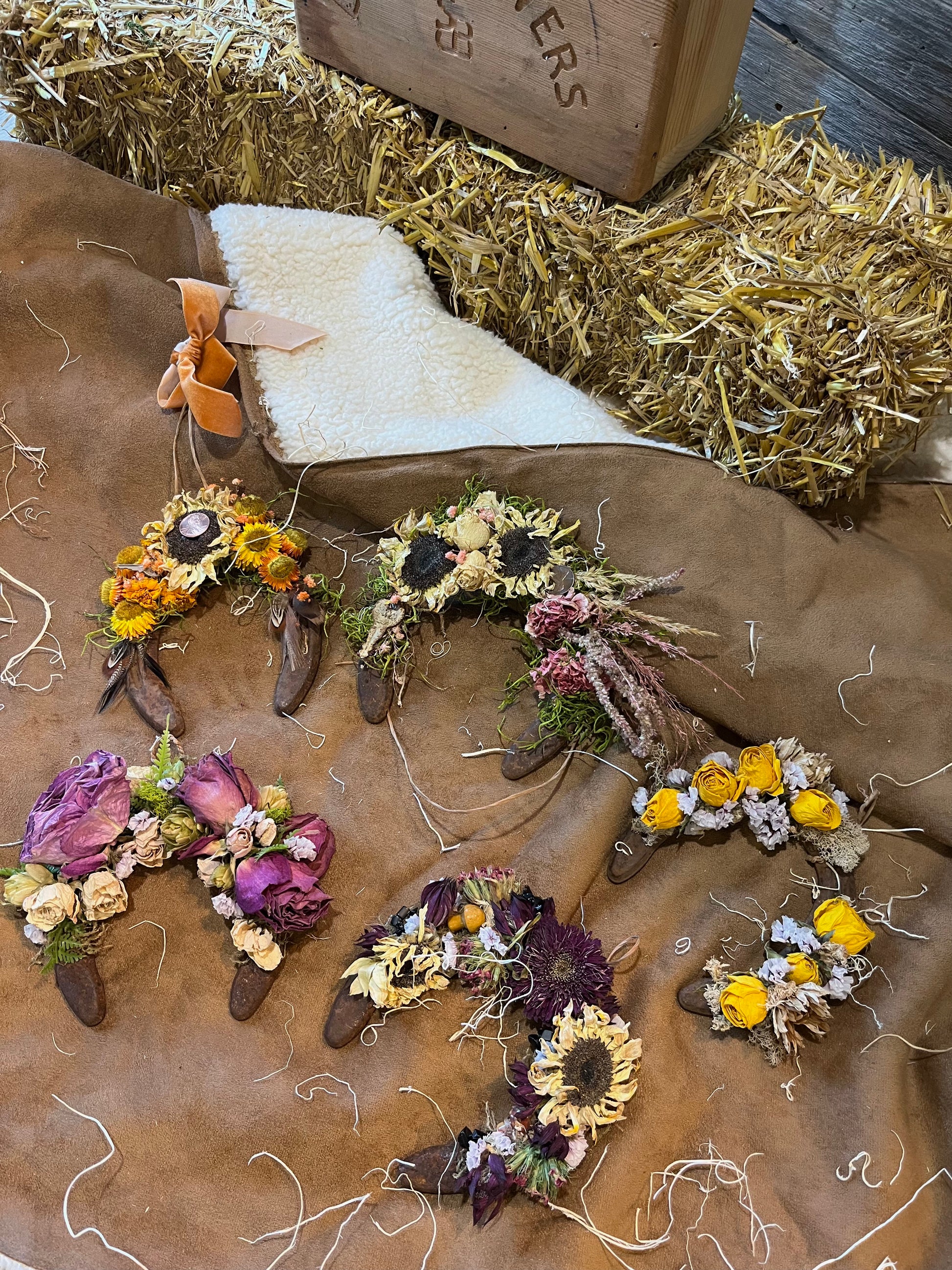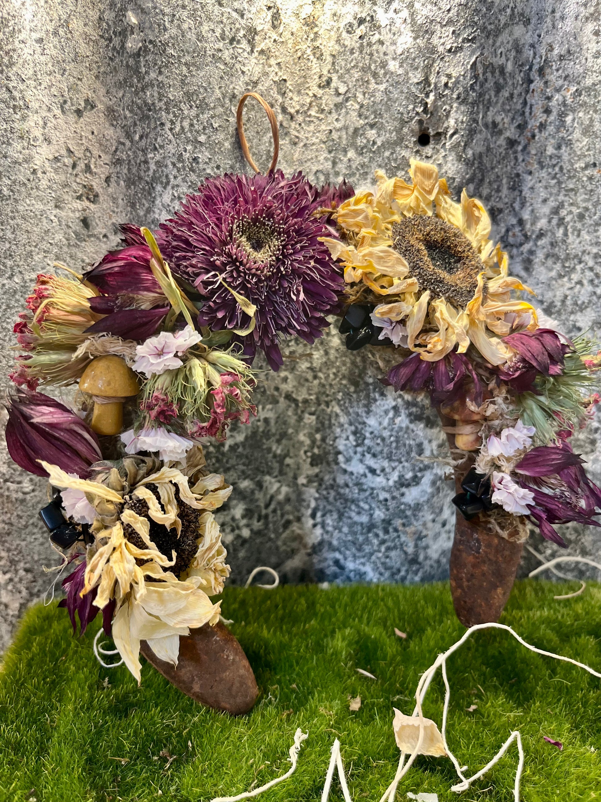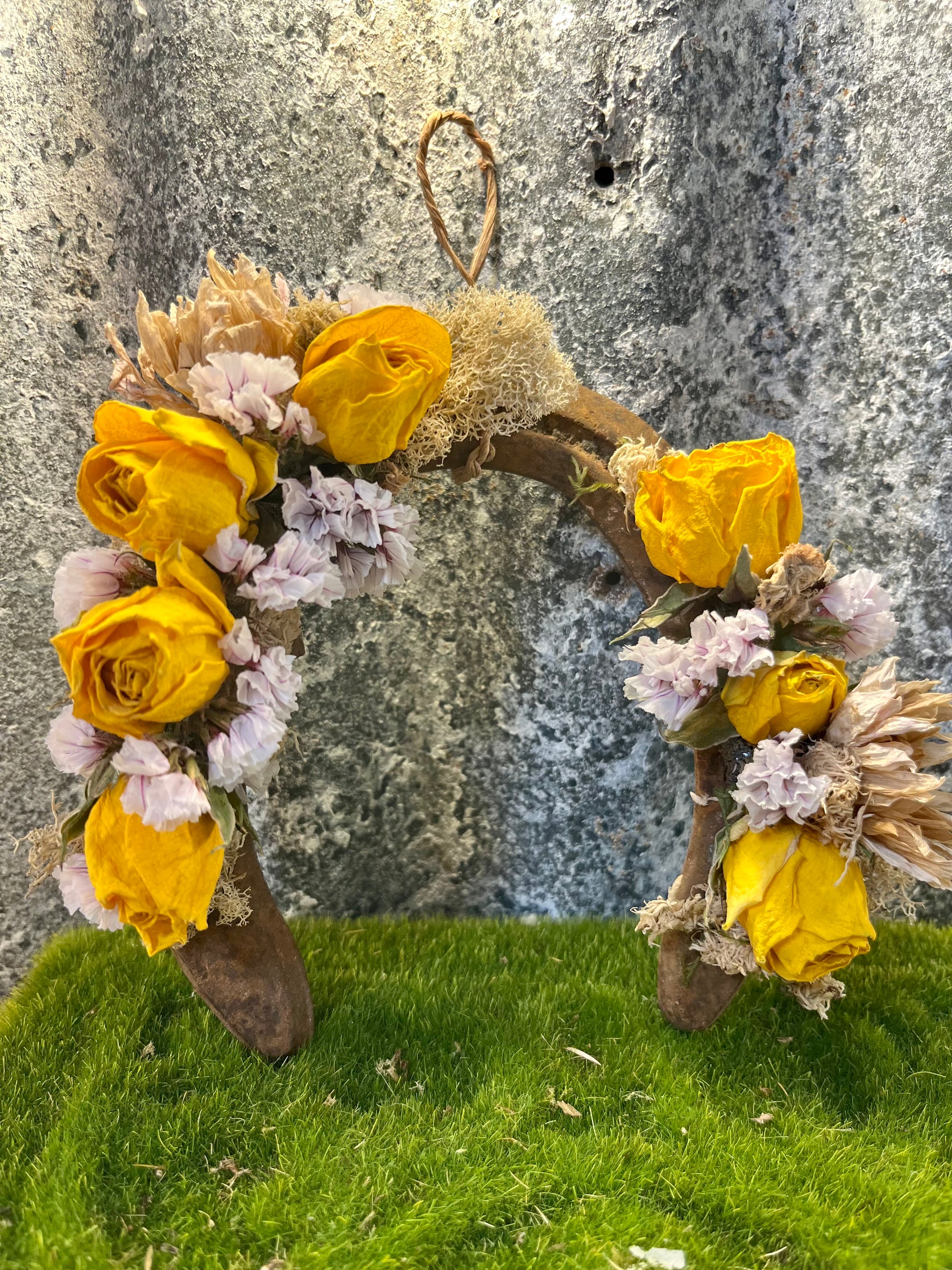 Decorative Lucky Horseshoe. Repurposed horseshoe adorned with dried flowers and other cute trinkets. Can be to placed anywhere around your home. Make's a perfect, one-of-a-kind gift!
