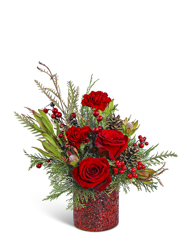 Magical Wish in Crimson is a striking winter arrangement featuring Roses, Carnations, Leucadendron, Pinecones, and premium winter foliage. Designed in a festive red sparkle cylinder vase, it's perfect for adding rich seasonal color to any space. Our floral designer will make thoughtful substitutions as needed to ensure the overall look and feel is beautifully maintained.