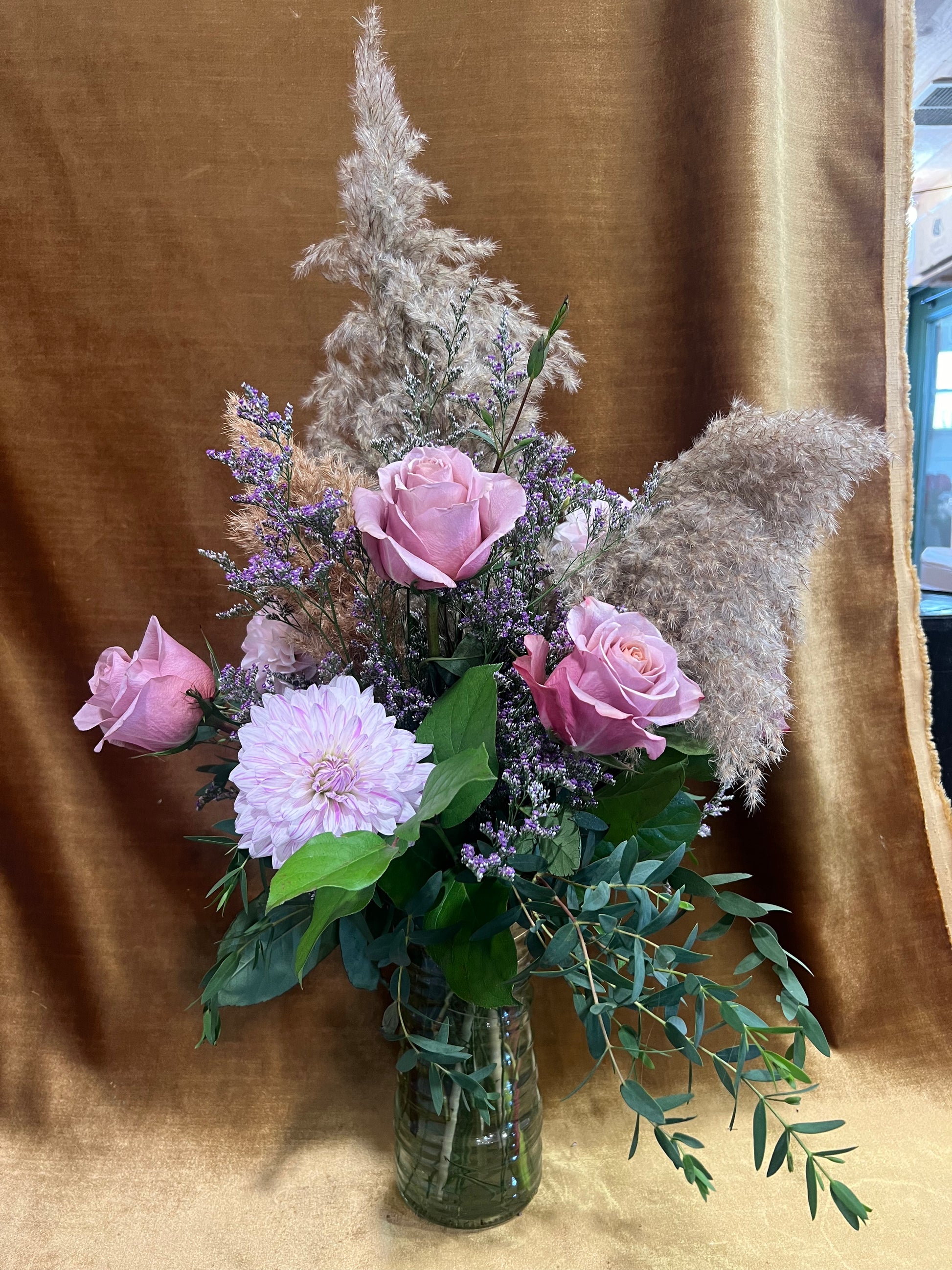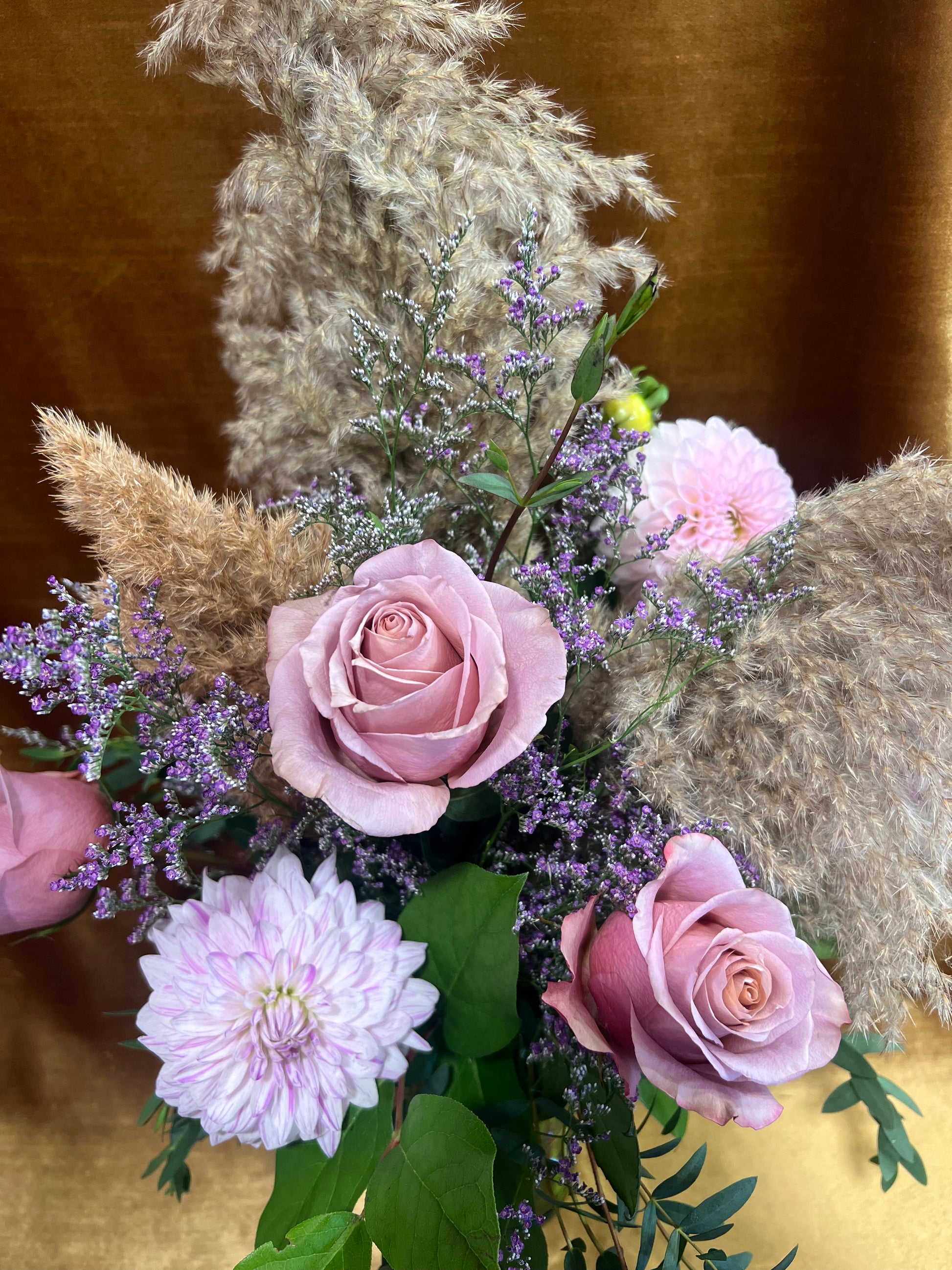 Soft and romantic, Moonlight Mauve glows with the gentle beauty of twilight. Mauve roses take center stage among airy lavender statice, fresh eucalyptus, and lush greenery — creating a dreamy balance of texture and tone. Arranged in a clear glass vase, this design captures the quiet elegance of moonlit evenings and the tender calm of blooming love. Perfect for thoughtful gifting or adding a touch of serene beauty to any space.