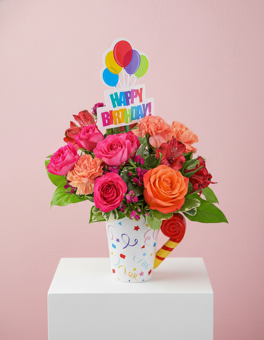 Celebrate a special birthday in the most exquisite way. This Mug of Celebration arrangement is filled with beautiful flowers like Roses, Dianthus, Carnations, Alstroemeria, and premium foliage. We will hand-deliver this festive design in a food-safe mug that will make their coffee breaks extra fun. Perfect for any festive occasion, from birthday parties to graduations to retirements!
