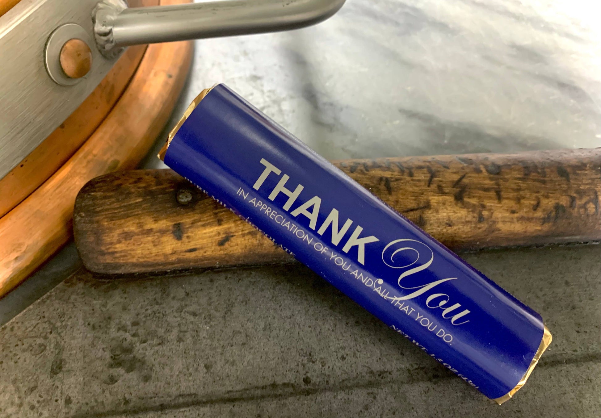 “THANK YOU- In appreciation of you & all that you do” SOLID Milk Chocolate Bar w/ pure milk chocolate & Nostalgic Gold Foil Wrapper.