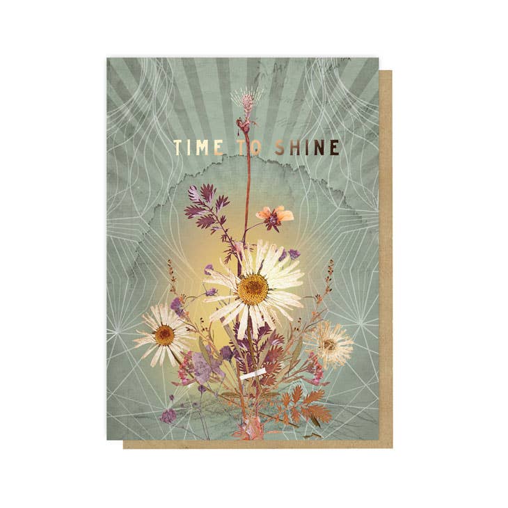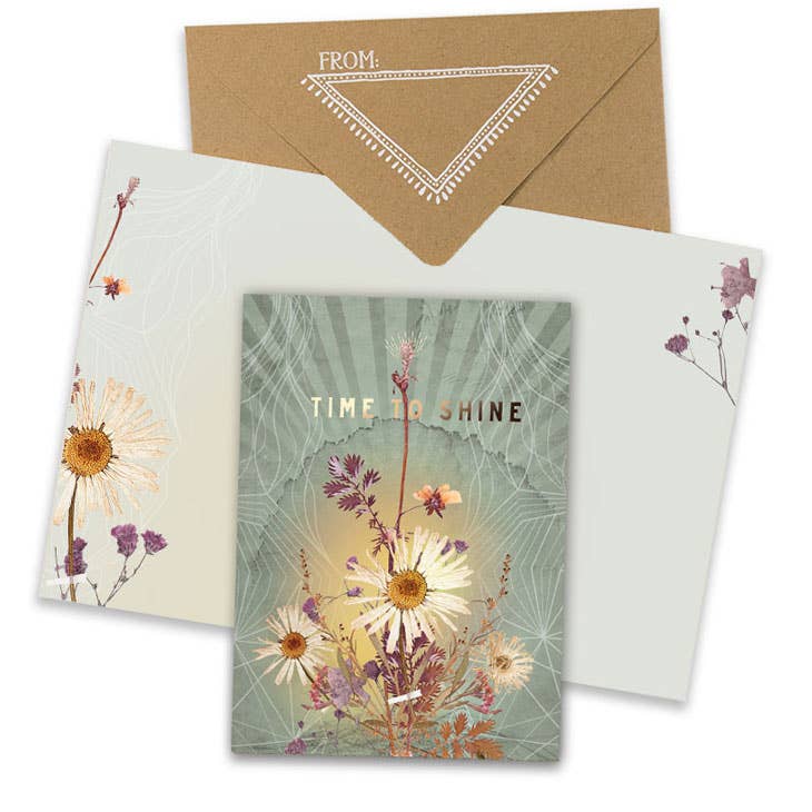 "Time To Shine" featuring pressed flowers and special gold foil finishing. Perfect for all occasions. 100% soft, premium quality recycled paper Blank inside but gently illustrated with full color designs Decorative screen printed, kraft envelope Front is embellished with fine gold foil details