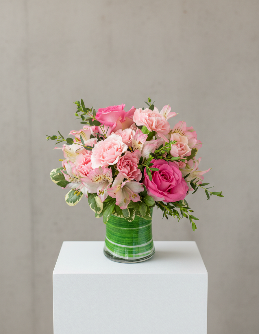 Pink Sugar is a contemporary flower arrangement that combines roses, alstroemeria, and carnations surrounded by a variety of foliage. This soft pink design is the perfect gift for an anniversary, birthday, or just because! We offer local flower delivery and many consider us the best local florist. Whether you order online or give us a call if you want to speak to one of our floral experts, we’re ready to listen to your story, craft a beautiful bouquet, and expertly deliver it to your loved one.