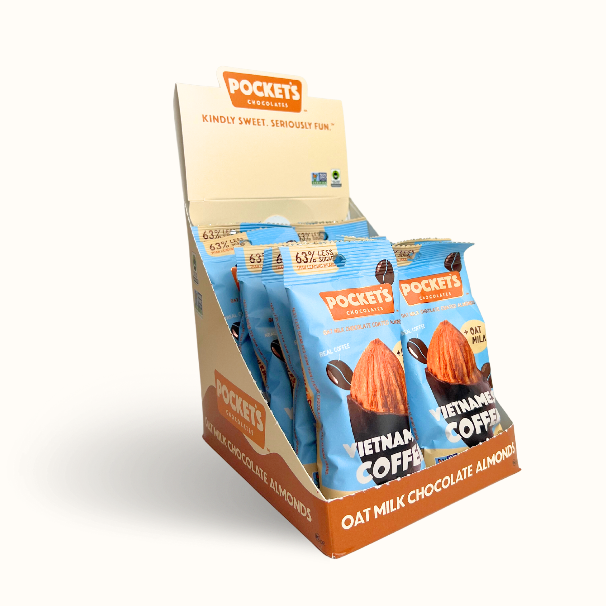 Vietnamese Coffee chocolate coated almonds are made with our Signature Oat Milk Chocolate.