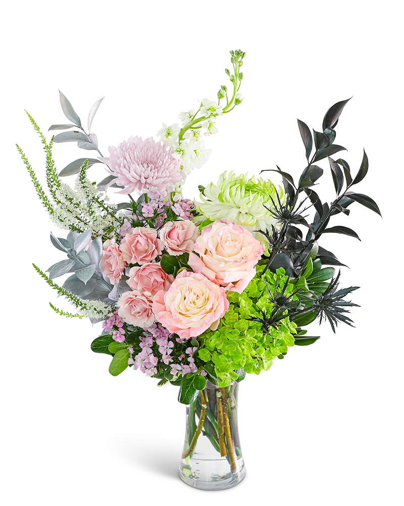 Popular and Powerful blends glitter-kissed pink roses, Cremons, Veronica, Stock, Dianthus, Hydrangea, Eryngium, and deep, dramatic foliage for a striking, high-contrast look. This bold design celebrates unexpected pairings and a style that refuses to fade into the background. Send a delivery and share something truly memorable.