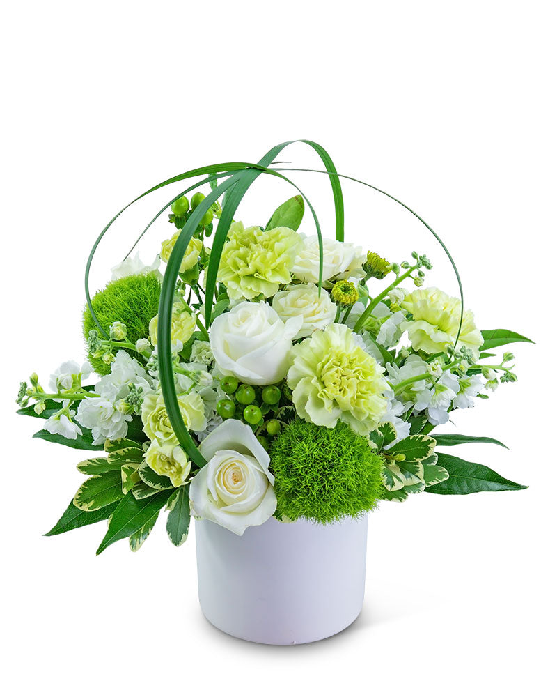 The tranquility of nature is captured in the creamy whites and greens of this arrangement. Pure Sanctuary features roses, carnations, mums, green ball dianthus, hypericum berries, and assorted foliage with a lily grass accent. This piece will make any home or office feel like an oasis.