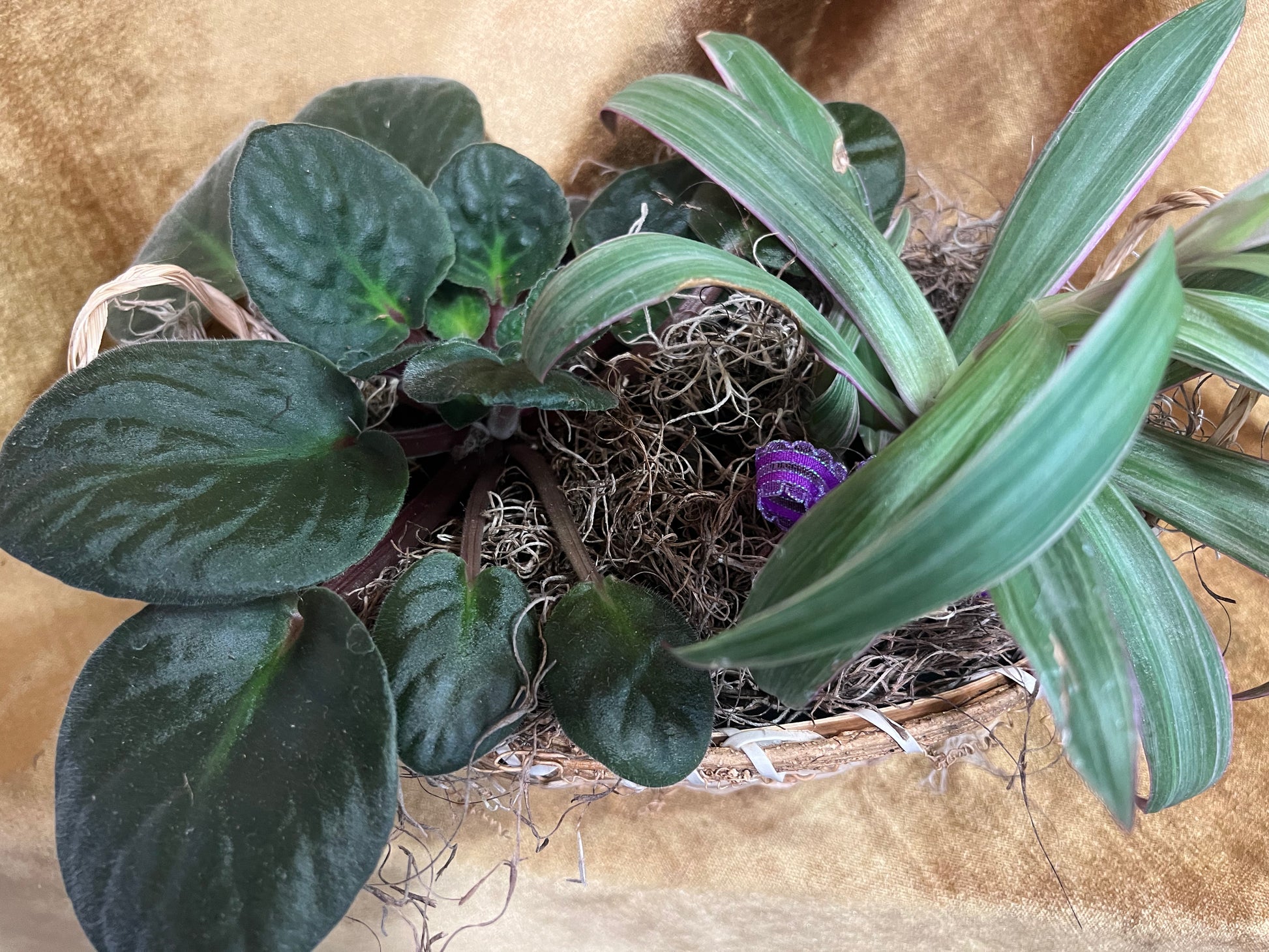 A charming mix featuring the soft blooms of an African Violet paired with the striped foliage of a Tradescantia. Arranged in a woven basket, this piece adds a touch of color and elegance to any tabletop or windowsill.