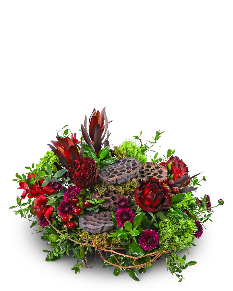 Rosewood Embrace is a rich mix of deep red roses, burgundy blooms, vibrant greenery, and unique lotus pods that add a natural touch. Designed low and wrapped in willow vines, it makes a beautiful centerpiece for your home or event. Our local florist may make a few thoughtful substitutions to ensure fresh, on-time flower delivery while keeping the same warm, earthy vibe.