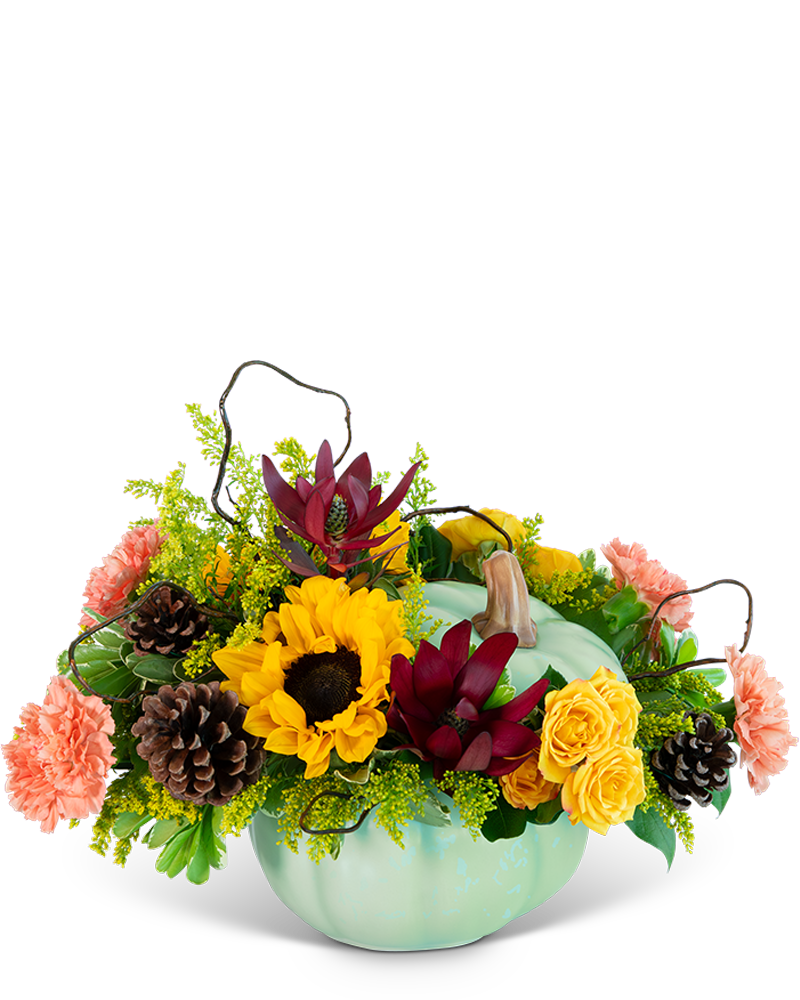 Radiate the warmth of the season with our Sage Pumpkin Glow arrangement, featuring a harmonious mix of sunflowers, roses, carnations, and premium foliage artfully arranged in a sage green ceramic pumpkin. This timeless piece exudes autumn charm and elegance, making it the perfect centerpiece for any fall gathering or a stunning gift to brighten someone's day with a touch of seasonal beauty.