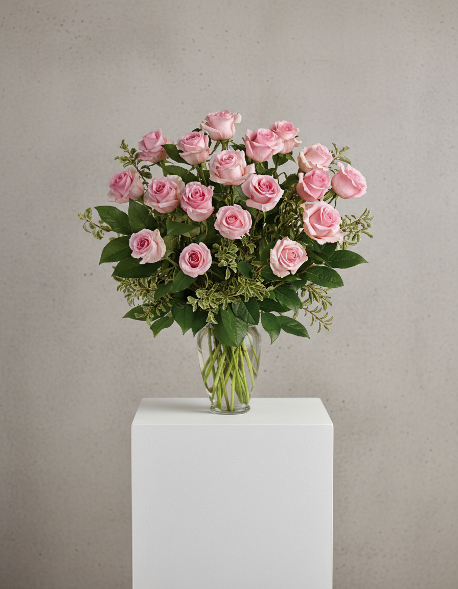 Soft as a sigh and just as unforgettable, this elegant bouquet features a dozen and a half blush-pink roses nestled among lush, deep greens. Delicate yet undeniably romantic, these roses speak volumes—perfect for anniversaries, declarations of love, or simply reminding someone how deeply they’re cherished.