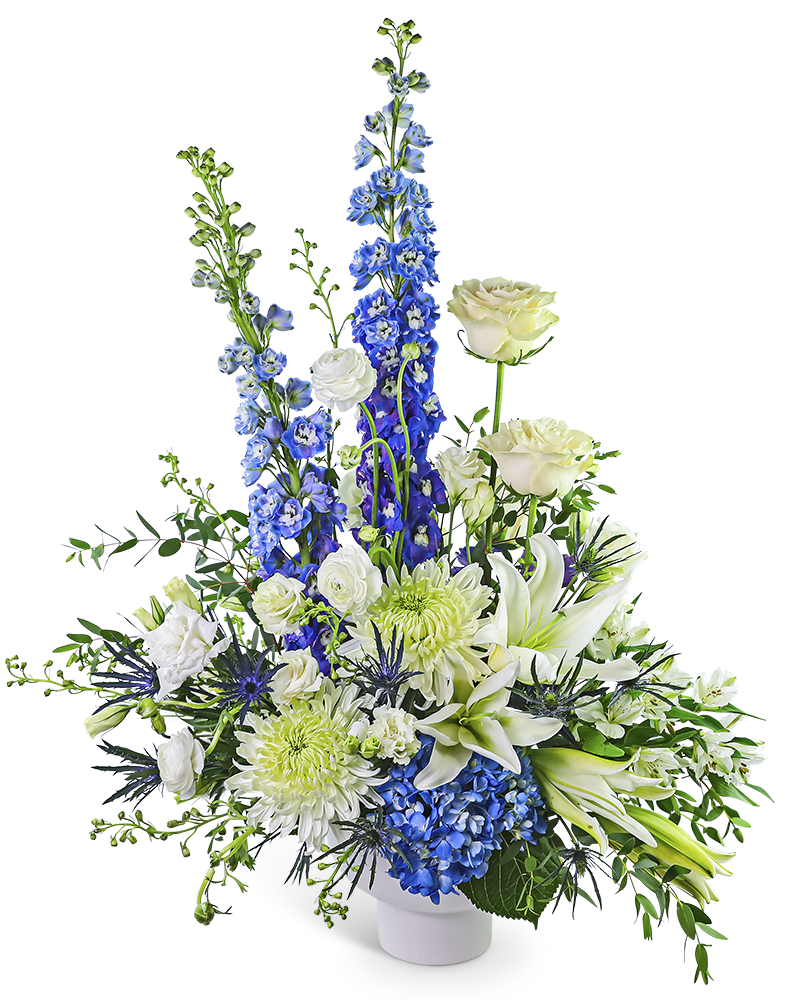 Skybound Stillness is a graceful arrangement of Lilies, Roses, Hydrangea, and Delphinium that evokes calm and beauty. Designed in a sleek white vase, it's a stunning option for sympathy flowers, memorial services, or moments of reflection. Each flower arrangements is created with care, and blooms may vary slightly based on seasonal availability.