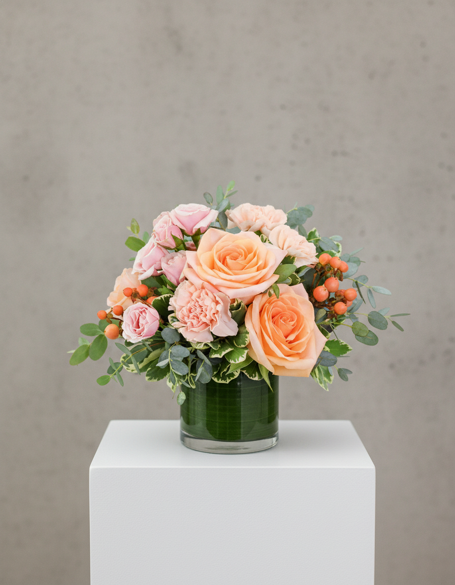 Sorbet Sweetie may look good enough to eat but it’s even more beautiful to receive and display! This floral design is a soft collection of roses, carnations, hypericum berries, and assorted foliage in a leaf-lined vase. As irresistible as its namesake, it’s the perfect gift for an anniversary, birthday, or any special occasion. We offer same-day flower delivery in most cases.