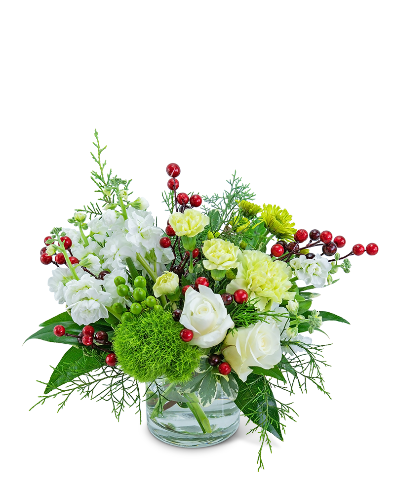Add a little sparkle to a winter day with this cozy arrangement! Roses, carnations, mums, green ball dianthus, green and red berries, evergreen, and a variety of foliage are displayed in a clear container. Sparkling Berry is the perfect way to add a touch of warmth to any home or office.