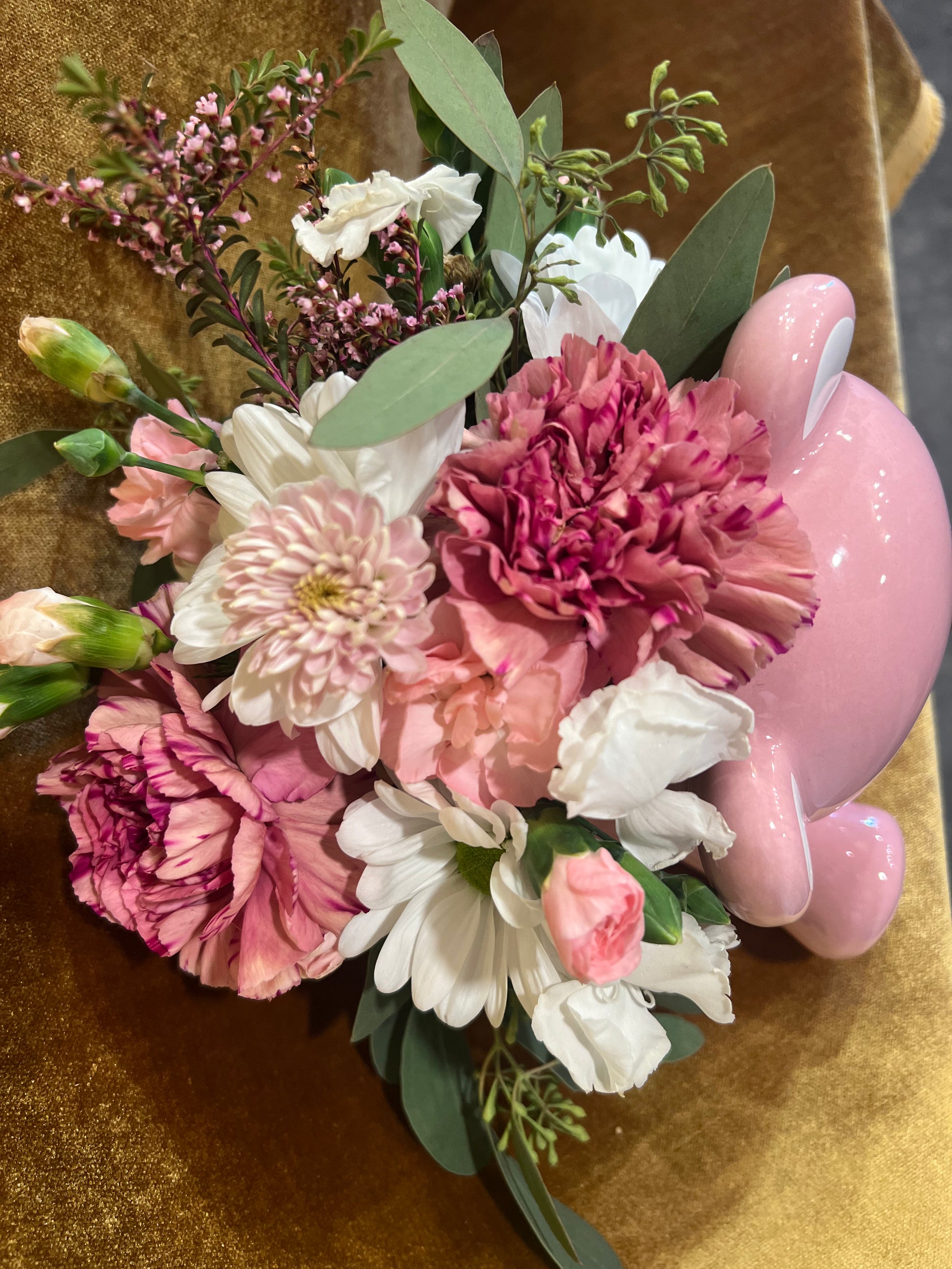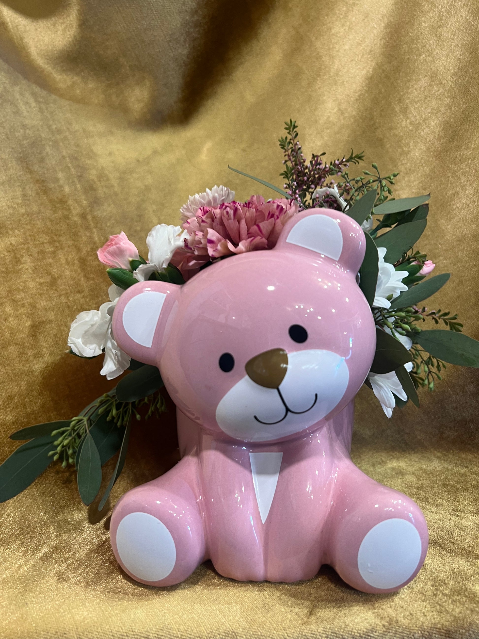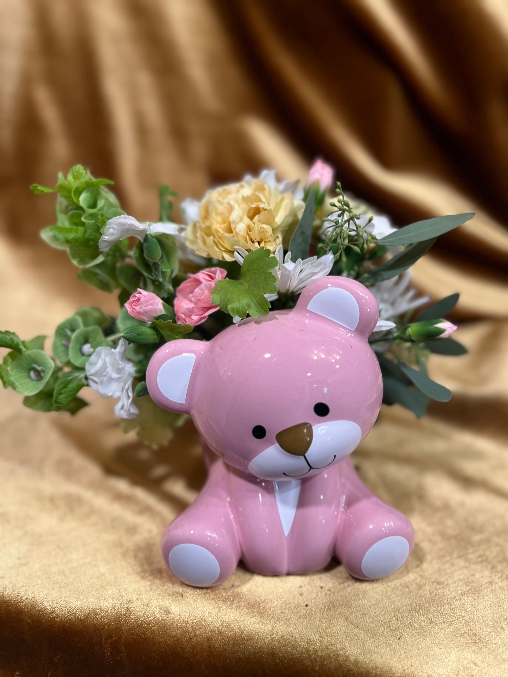 Celebrate new beginnings with Sweet Little One, a charming bouquet featuring delicate Bell's of Ireland, soft carnations, and cheerful mums. Enhanced by lush foliage and presented in a keepsake pink ceramic baby bear, this arrangement is a heartfelt gift that brings joy and warmth to any nursery or celebration.