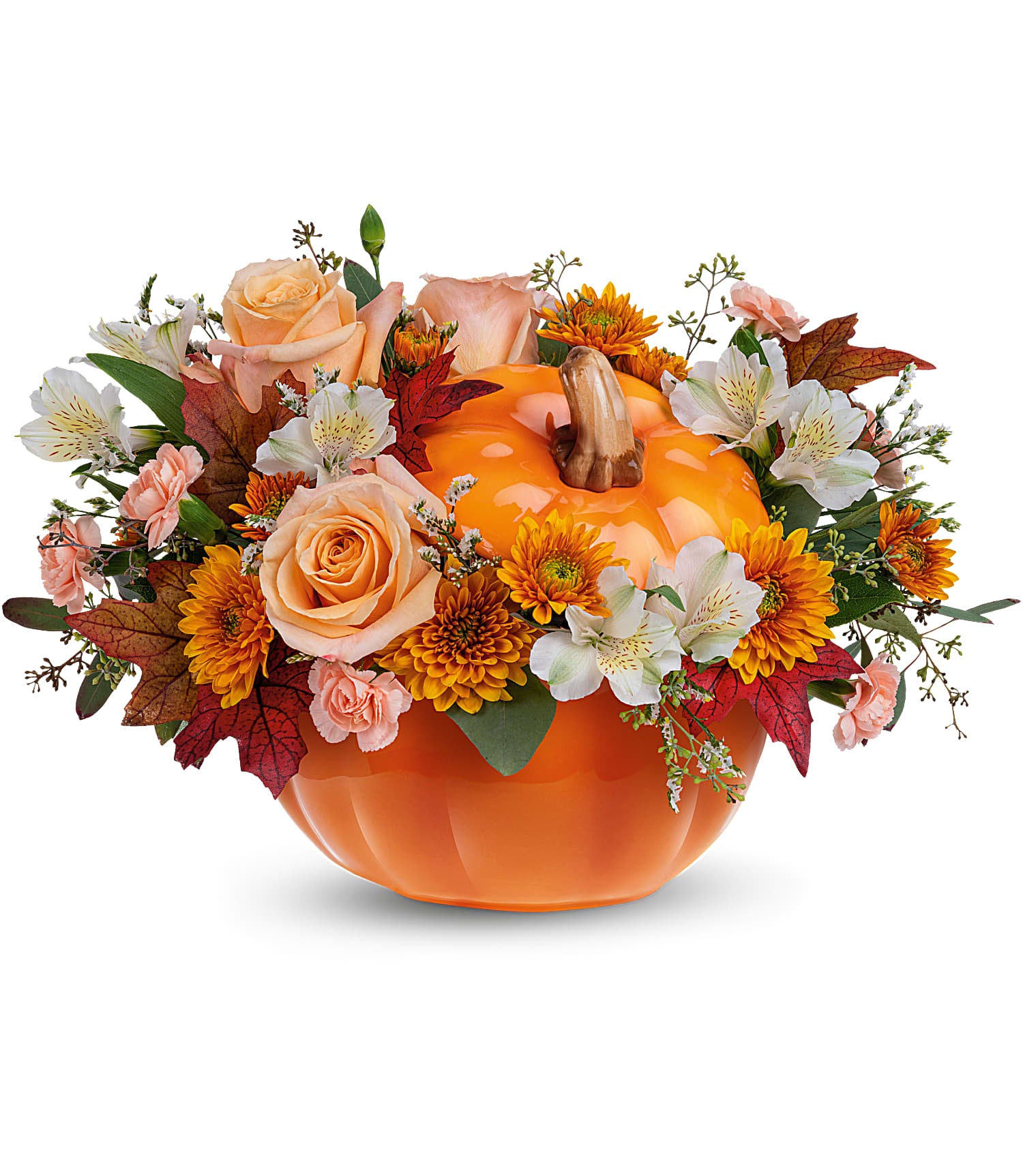 Welcome Fall into your home with this warm and cozy, Hello Pumpkin arrangement. The autumnal mix will add a sophisticated touch with crème roses combined with the warm hues of bronze chrysanthemums and peach mini carnations!