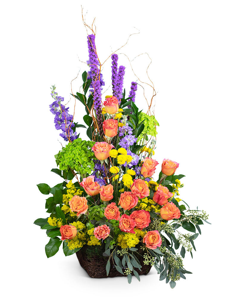 Sympathy flowers are a meaningful way to celebrate the life of the deceased, and forever treasure the memories you made together. Our Treasured Memories design features Free Spirit roses, sunflowers, bright pink carnations, liatris, stock, green hydrangea, solidago, curly willow, and premium foliage. Funeral flowers bring healing in many ways, they serve as a memorial to honor the one that we lost, all while providing comfort to the friends and family left behind.