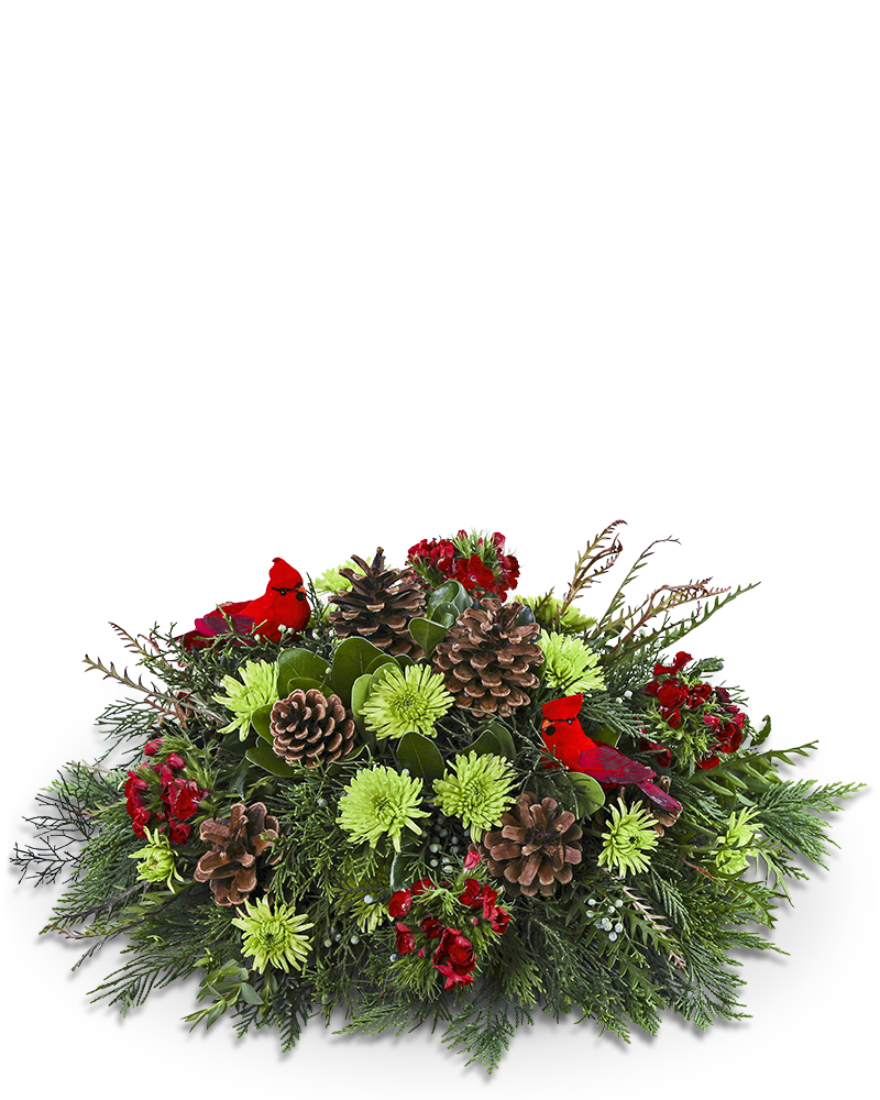 Where Cardinals Gather Centerpiece is a charming winter arrangement featuring Spray Mums, Sweet William, Pinecones, and premium winter foliage, with festive cardinals nestled in for a heartwarming touch. Perfect for dressing up a winter table, it brings a cozy and natural feel to seasonal gatherings.